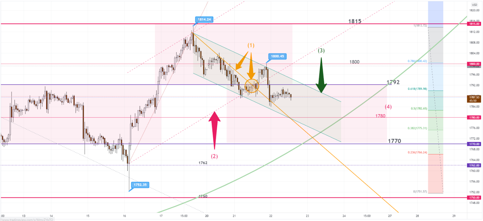昨日提及的上升通道(2)未能成形,買盤未能在1小時圖上形成較明顯的升趨勢。而在美盤回落至1792以下後,黃金已正式回到1770-92(4)。剛形成的短線下降通道(3)會為金價帶來壓力。而昨日提及的1小時圖中線圓底,黃金價格須維持在1780之上。