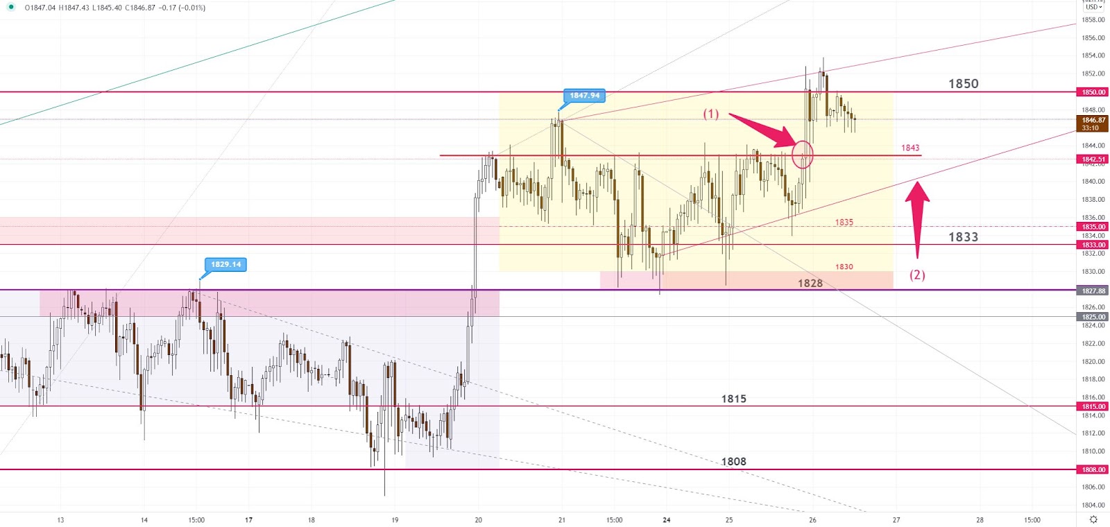 1小時圖金價昨日嘗試突破1850阻力,但未能成功,整體仍在1830-50區間內震蕩。短線下方1843會出現明顯支持,而區間內下方趨勢線亦續步被推高(2)。突破前,日內操作仍以1830-50為主。