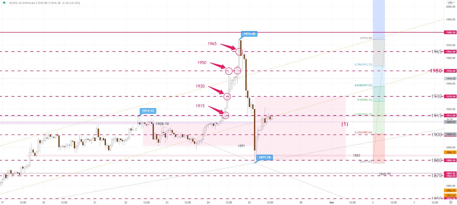 昨日走勢受消息主導,因上升(或美盤的下跌)速度太快太急,只要突破關鍵阻力(或支持) – (1915/1930/1950/1965),趨勢基本上只會到達下一阻力方會停止。而經過昨日一輪消息後,現時金價已回到昨日開市水平,彷佛戰爭從未開始。開戰消息整體已被市場消化,短線再以消息推高至1950以上的機會不大。若日內趨勢繼續急速變化,可繼續以”層級區間”作交易策略 – (1870/1880/1900/1915/1930/1950/1965/1975)。日內交易區間初步設定在1880-1930(1)。