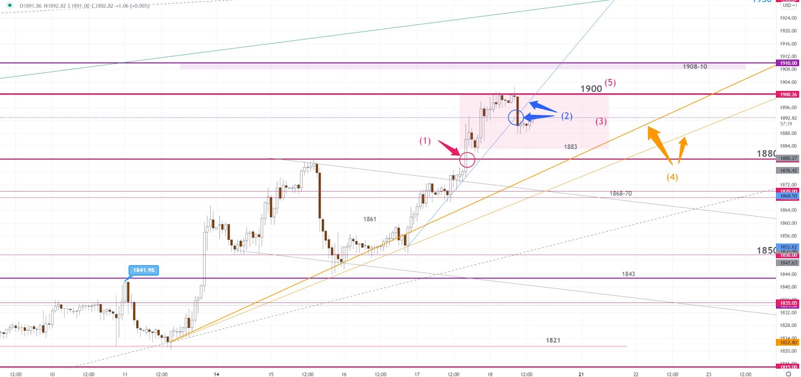 昨日往上突破繼續由消息主導,突破1880後的第一個上方目標1900已經到達。今早亞盤從1898回落到早段低位1887,跌穿了昨日較急的短線上升趨勢線(2),上升趨勢在亞/歐盤將暫時放慢,而早段短線交易區間會在1883-1900(3)。昨日提及的上升趨勢線(4)繼續有效,關鍵阻力繼續留意1900(5),若在較後時段抽升,下一目標會在1908-10附近。