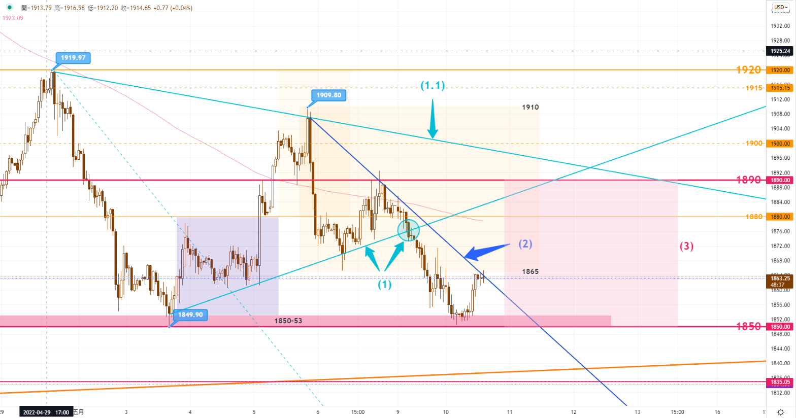 Gold has been under the selling pressure from the downward trendline(2) on the 1-hour chart. Within the next 24 hours, the price must climb above Trendline(2) in order to stay within the 1850-90 range-bound; otherwise, a new round of selling will begin after it clears the support at 1850.