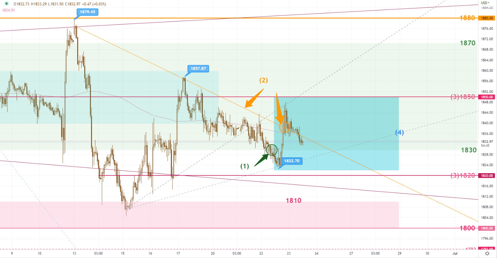 黃金繼續在1835附近徘徊。昨日開盤在1832,早段亞盤跌穿1830支持,回落到本週最低1822。美盤開市交投轉趨活躍,突破下降阻力線(2)後觸發一輪買盤入市,金價升至全日最高1848,隨後回落到1837收市,微升4美元。