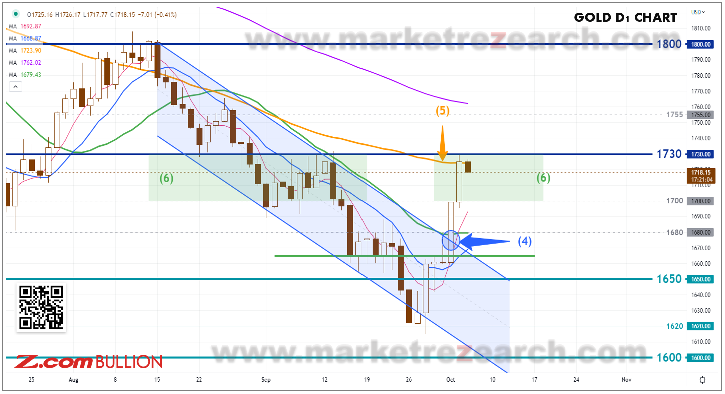 日線圖 – 黃金在週一升穿下降通道(4)及20天移動平均線後觸發一輪買盤,價格一直上漲到50天移動平均線(5)。日內除非金價能突破1730再觸發新一輪買盤,否則未來48小時金價將會在1700-30區間內震蕩。