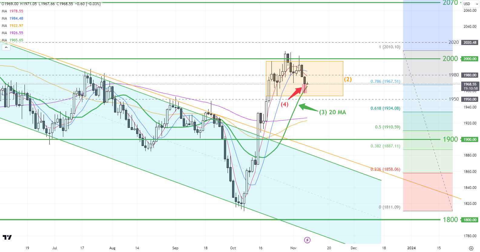 黃金昨日做出近2星期低位。早段亞盤承接前日收市前弱勢一直往下,先試1970的區間底部支持。歐盤跌勢繼續一直回調到全日最低1956,美盤開市反彈正式開始,全日收盤在1969,下跌8美元。