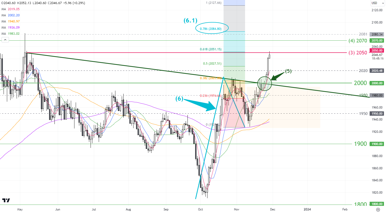 日線圖 – 黃金突破阻力線(5)後,整體以上升趨勢主導,初步2050(3)目標已到。現時以之前的上升浪(6)及調整作比例推算,只要價格能突破2050(3),初步目標可留意2084(6)。