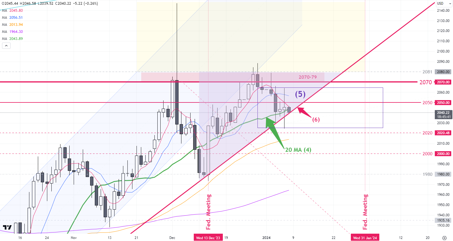 日線圖 – 20天移動平均線(4)仍然有效,經過上週五美就業數據後,數據做好讓美金走強令金價走弱,但同時亦強化美國經濟 “軟著陸” 提早減息的預期,令市場仍未有明確方向。早前提及的上升支持線(6)仍然有效,本週須留意日線圖較大的三角形趨勢(5),未來1週必須突破上方阻力2070-80,否則日線圖將脫離上升支持(6),結構將進入橫行格局。