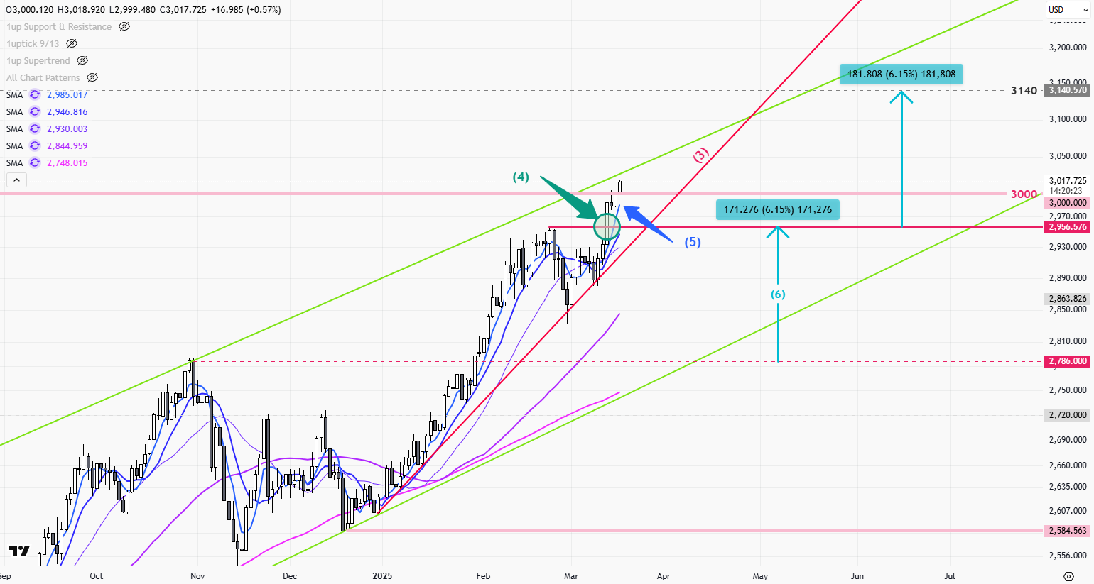 1小時圖(上圖) > 上升趨勢未有放慢跡象,今日亞盤突破3000後,策略繼續逢低買入。轉勢訊號會是金價回落到關鍵支持3000以下。