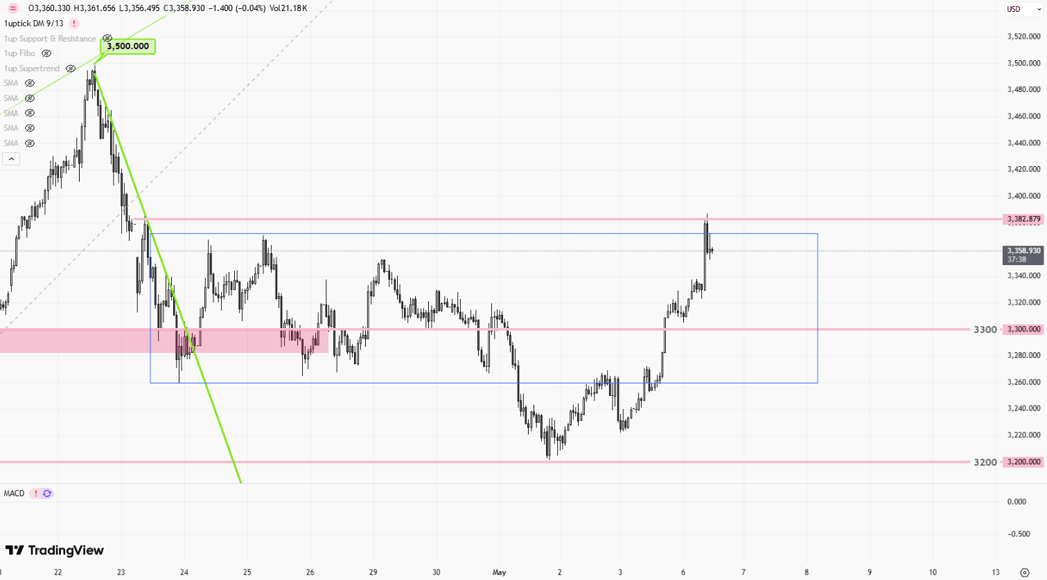 技術走勢方面,金價目前穩站5日、20日與50日移動平均線,MACD柱狀圖連續上升,展現短線動能。下個壓力位將落在3,352美元一帶,若突破,有機會挑戰去年高點3,500美元之上。不過,市場的下一個重要觀察點在聯準會即將公佈的利率決議(5月7日)以及本週末的非農就業數據(5月9日)。若鮑威爾在會後記者會中暗示美國經濟仍具韌性、能承受現行高利率,恐導致市場重新評估降息時點,進而對金價產生技術性拉回壓力,關鍵支撐區落在3,290美元。