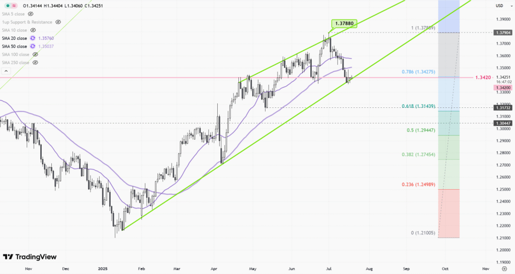 目前 GBPUSD 仍穩居日線空方趨勢,指標與型態皆偏弱,續跌風險高。下方觀測重點為 1.3365,失守後目標看向 1.3295–1.3233 支撐區。若短線反彈至 1.3484,預期仍將受壓,供部位調整或順勢加碼參考。近期未出現明顯多方反轉訊號,投資策略建議保持謹慎,不建議逆勢操作,除非價格走勢或宏觀背景出現重大變化。