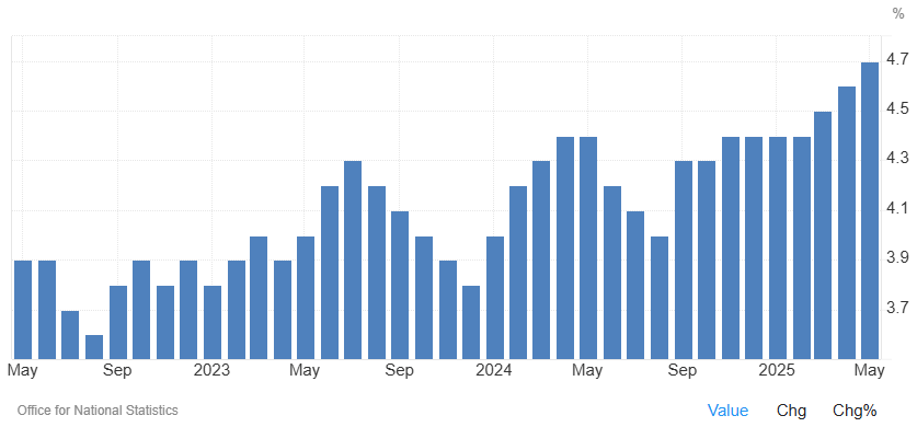 7月17日公布的英國就業數據顯示勞動力市場持續疲軟。失業率從4.5%上升至4.7%,為四年來最高水平。3月至5月期間,失業人數增加了98,000人,年比增加124,000人。