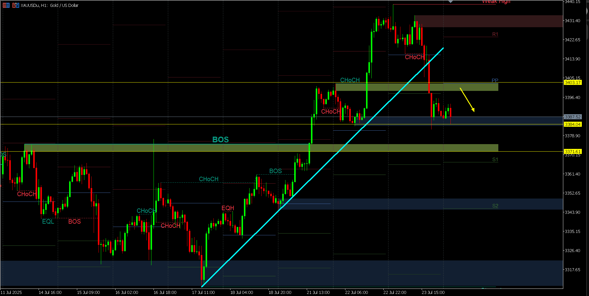 黃金(XAUUSD)上週波動明顯,價格自3,319美元附近的支撐位攀升,最高觸及約3,439美元,隨後略微回落並在3,423美元附近穩定。這波多頭動能主要受惠於美元走弱及美聯儲發出鴿派訊號,市場對政策寬鬆的預期提升。然而,因美國新貿易協議及關稅利好消息引發的多頭利好有所修正,避險需求減退,促使價格進行回調。其他影響因素包括美國經濟持續疲弱、全球市場不確定性延續以及地緣政治緊張局勢,這些因素共同支撐黃金作為避險資產的吸引力。展望未來,整體趨勢仍偏多,短期內可能會有整理或修正,但隨後有望再度攀升。