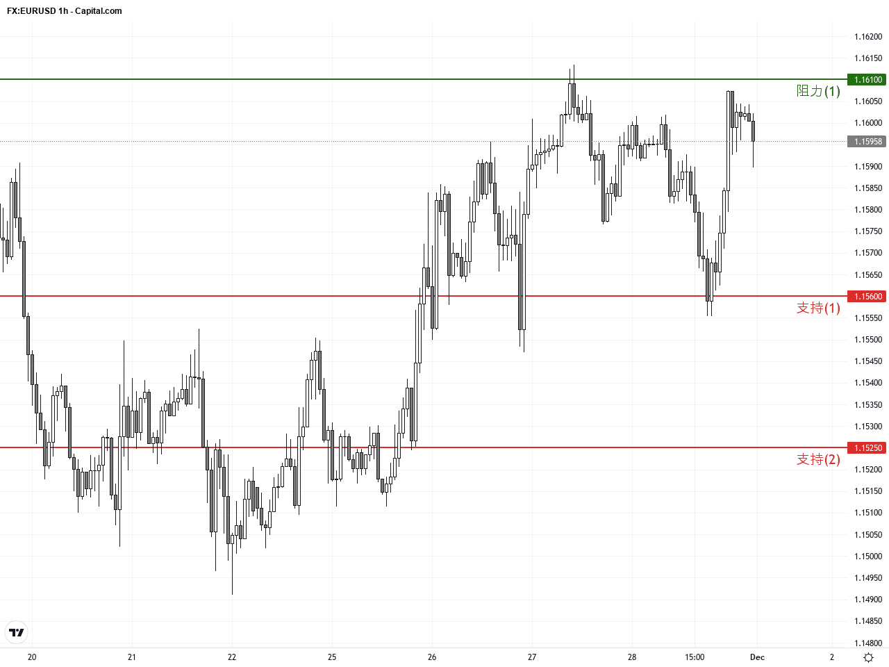 今日經濟日曆顯示,於GMT+1凌晨2:30將公布的中國11月製造業PMI與服務業PMI數據分別為49.2與49.5,均略低於市場預期。這可能對整體風險偏好造成輕微壓力,間接影響歐元兌美元,尤其是在亞洲盤時段。整體而言,今日沒有直接來自歐元區或美國的重大經濟數據,短期EURUSD波動更多將受技術面及市場情緒牽動。