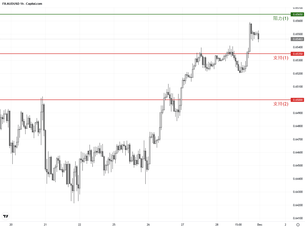 今日經濟日曆顯示凌晨2:30(GMT+1)公布的中國11月製造業與服務業PMI數據,其中製造業PMI略低於預期49.2,服務業PMI為49.5,同樣偏緊縮區間。此數據對AUDUSD影響有限,因中國為澳洲重要貿易伙伴,但PMI疲軟可能對澳元短線產生微幅壓力。今日無直接針對澳元或美元的重大經濟數據公佈,故整體經濟消息面影響偏向中性。