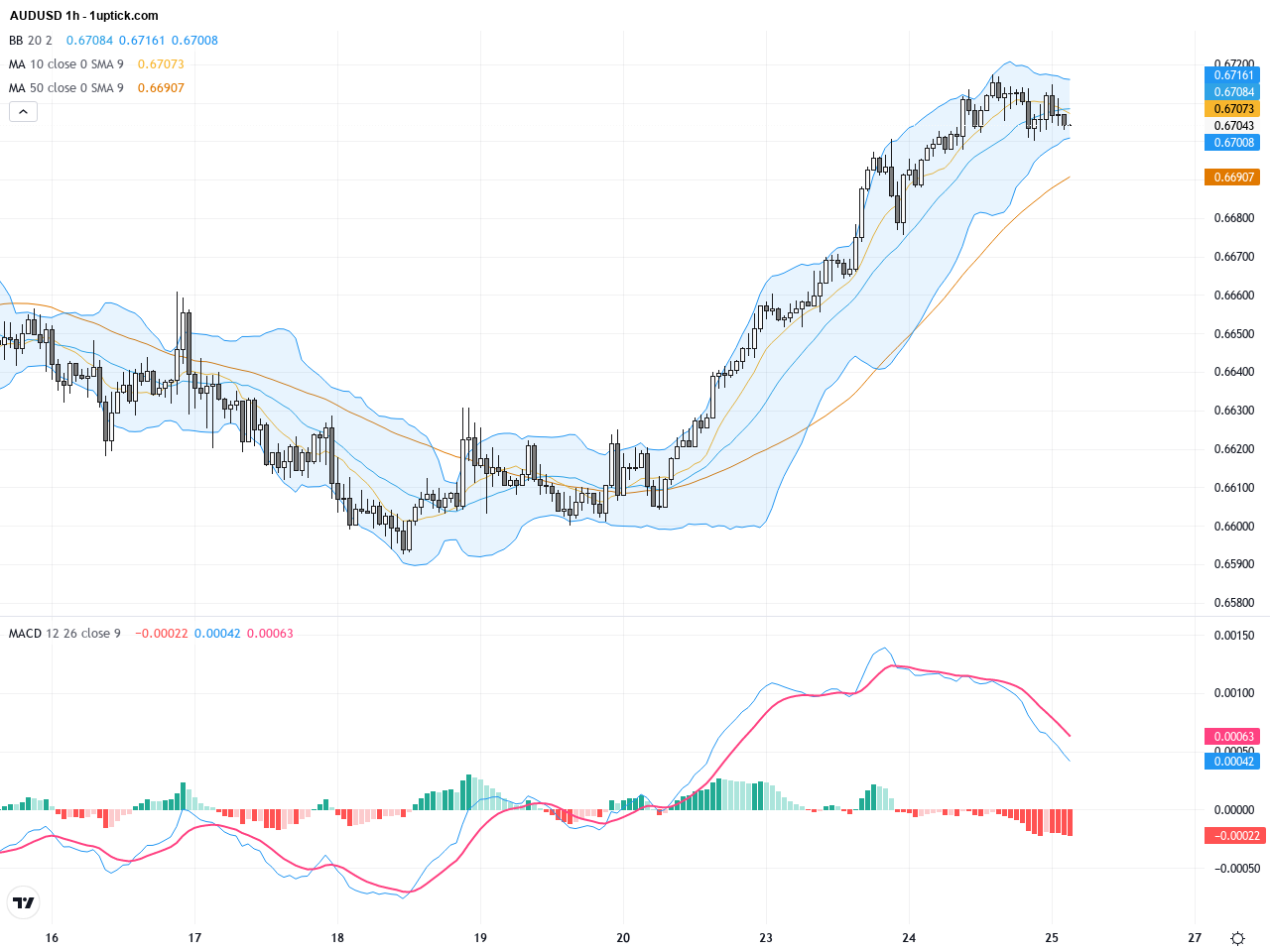 小時圖顯示過去3至5天內,價格圍繞0.6650至0.6717區間波動,近期突破0.6700後呈現震盪上升。短期移動平均線形成多頭排列,MACD維持正值且快線未見明顯死叉,RSI處於高位但未出現超買訊號。布林帶開口擴大,暗示短期波動可能加劇,但整體技術面仍支持進一步上攻。