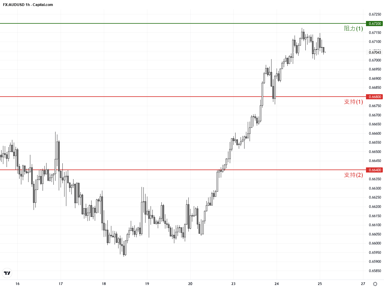 過去24至48小時,AUD/USD對美元匯率繼續強勁反彈,昨日收盤價報0.67114,延續近期突破0.6700大關的勢頭。匯價在歐洲交易時段一度觸及約0.6717的年內新高,創下逾一年以來的最高水準。