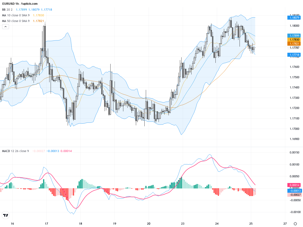 小時線圖顯示過去3至5天內價格出現震盪上行,近期突破1.1780的短期阻力後,價格在1.18水平短暫盤整。短期移動平均線呈現金叉形態,Bollinger Bands縮口後逐步擴張,顯示市場波動性加劇。MACD在0軸線上方發出黃金交叉,能量柱連續上升,暗示短期內多頭動能強勁。近期一根看漲吞沒形態的K線出現,短線看漲信號明顯,接下來可能延續小時級別的上行趨勢。