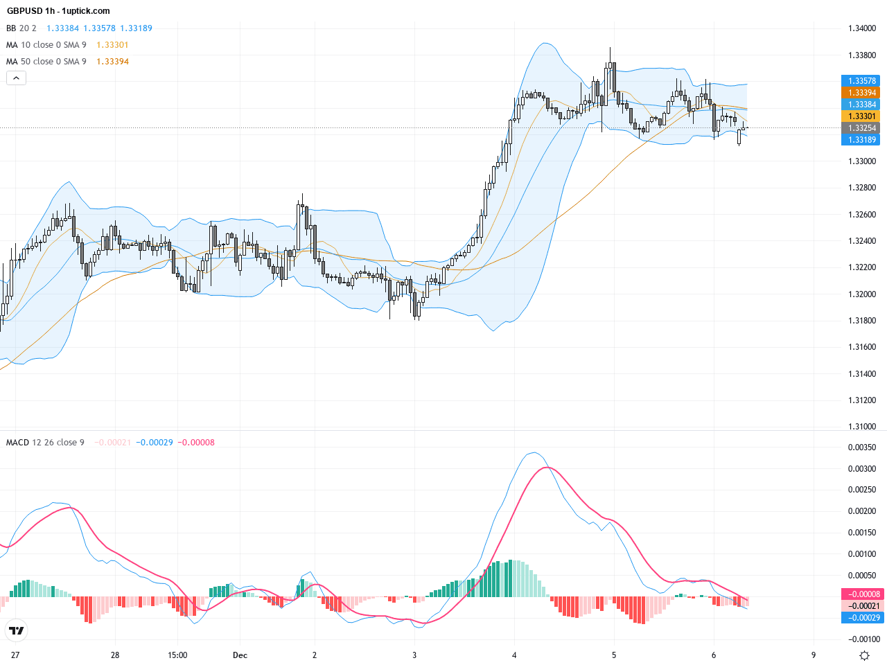 在過去三至五天的時線圖分析中,GBPUSD出現短期上升趨勢,但遇到1.3330的強阻力位置反覆受阻。短期移動平均線走勢向上,且MACD於零軸附近形成黃金交叉,顯示動能有望繼續增強。布林帶通道開啟,上軌為短期壓力位,值得關注價格能否順利突破以延續多頭格局。