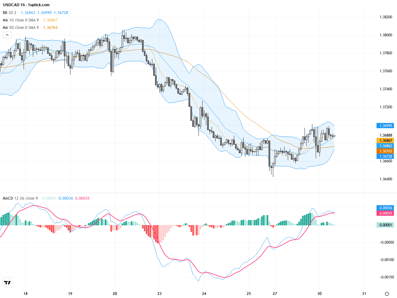 過去24至48小時,USD/CAD呈現小幅波動,昨日收盤價為1.36886,盤中最高觸及約1.36906,最低在1.3683附近。美元對加元略見回升,但整體趨勢依然表現出明顯的看跌傾向。這波動幅度反映市場在美加兩國經濟數據及國際油價波動的交織影響下保持謹慎。