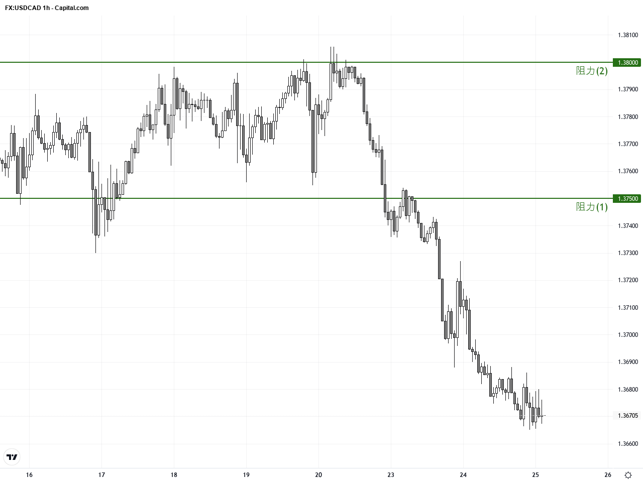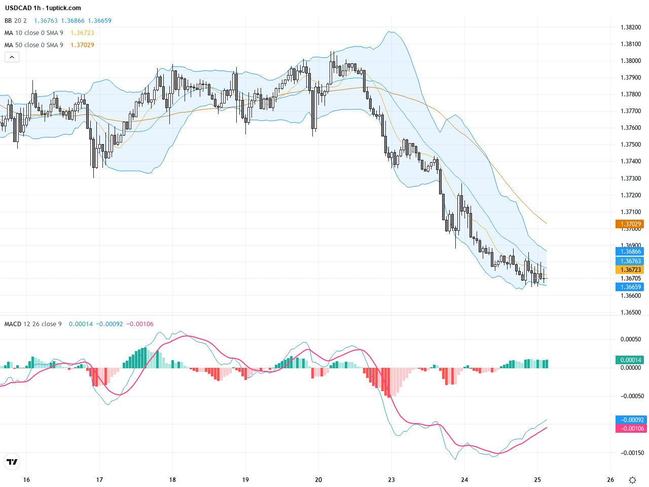 過去3至5日的1小時圖顯示,自上週末以來USDCAD加速下跌,短期均線迅速向下穿越長期均線。布林帶價格持續沿下軌移動,技術指標MACD與RSI均維持低位,顯現短期內賣壓不減。值得注意的是,近幾根陰線形成帶長下影線的錘形,意味短期可能出現短暫的技術性反彈,但整體趨勢仍偏空。