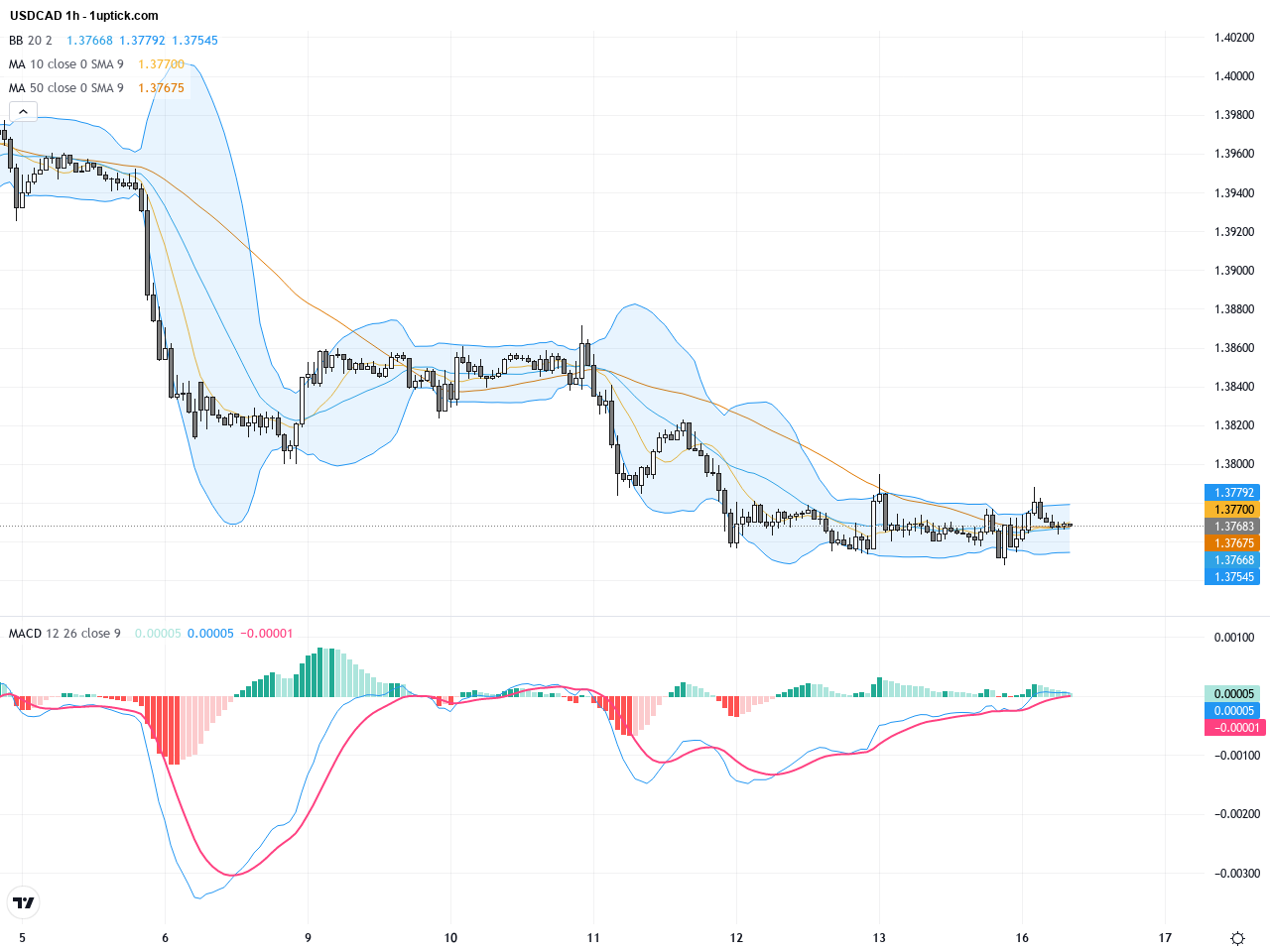 從近五天的每小時圖來看,USDCAD價格在1.37附近獲得支撐,多次反彈未能持續突破1.38阻力位。20期及50期移動平均線呈現短期交叉糾纏,布林帶上下軌逐漸趨於平行,暗示市場處於盤整狀態。MACD柱狀圖逐漸縮小,短期動能減弱,未出現明顯的多空趨勢信號。近期形成了一個橫盤整理態勢,短線交易需留意突破。