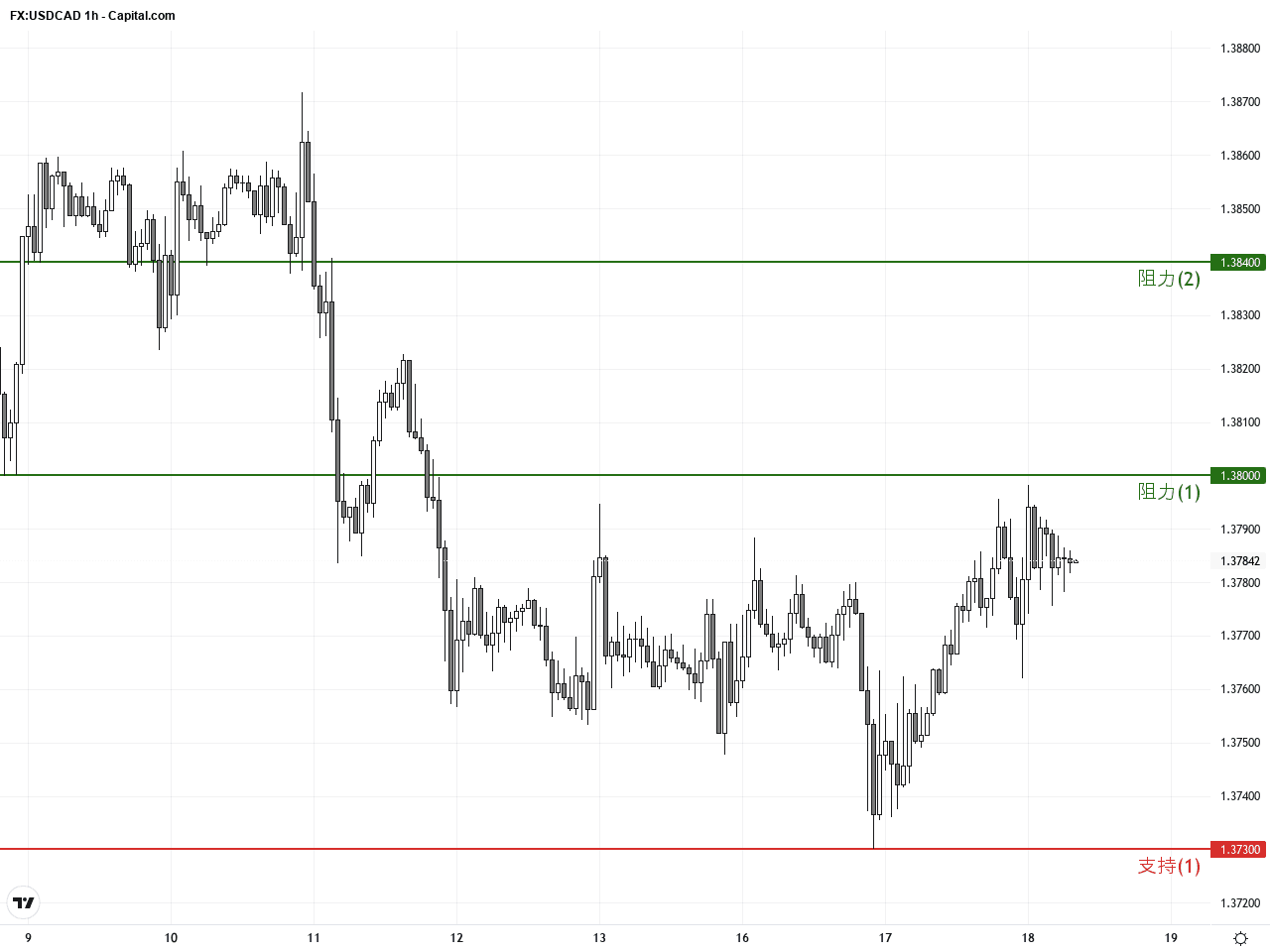 USDCAD:關鍵下降三角形測試1.38阻力,交易前景謹慎觀察
