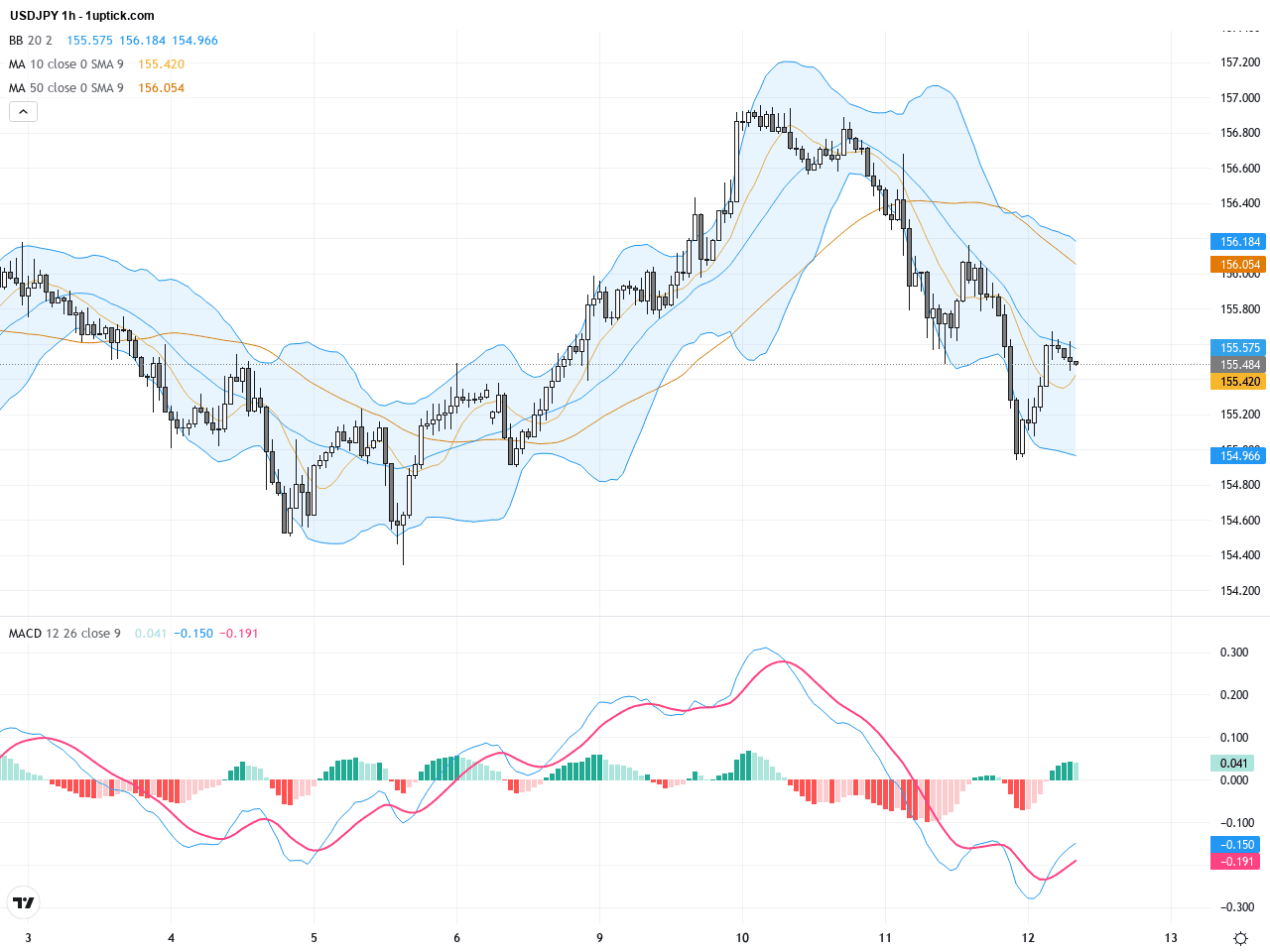 從日線圖可見,USDJPY近期整體呈現自年內高位158.856向下修正的趨勢,價格在50日均線153.59和200日均線148.25之上,維持中長期多頭格局。價格在12月初從約156.5回調,近期站穩約155附近整理。布林帶顯示價格觸及中軌後短暫回落,MACD柱狀體縮小且快慢線接近交叉,顯示趨勢有轉弱的風險,但尚未確認明確反轉。整體而言,日線圖暗示USDJPY處於震盪調整階段,仍須密切觀察關鍵技術位的反應以決定是否進一步下探。