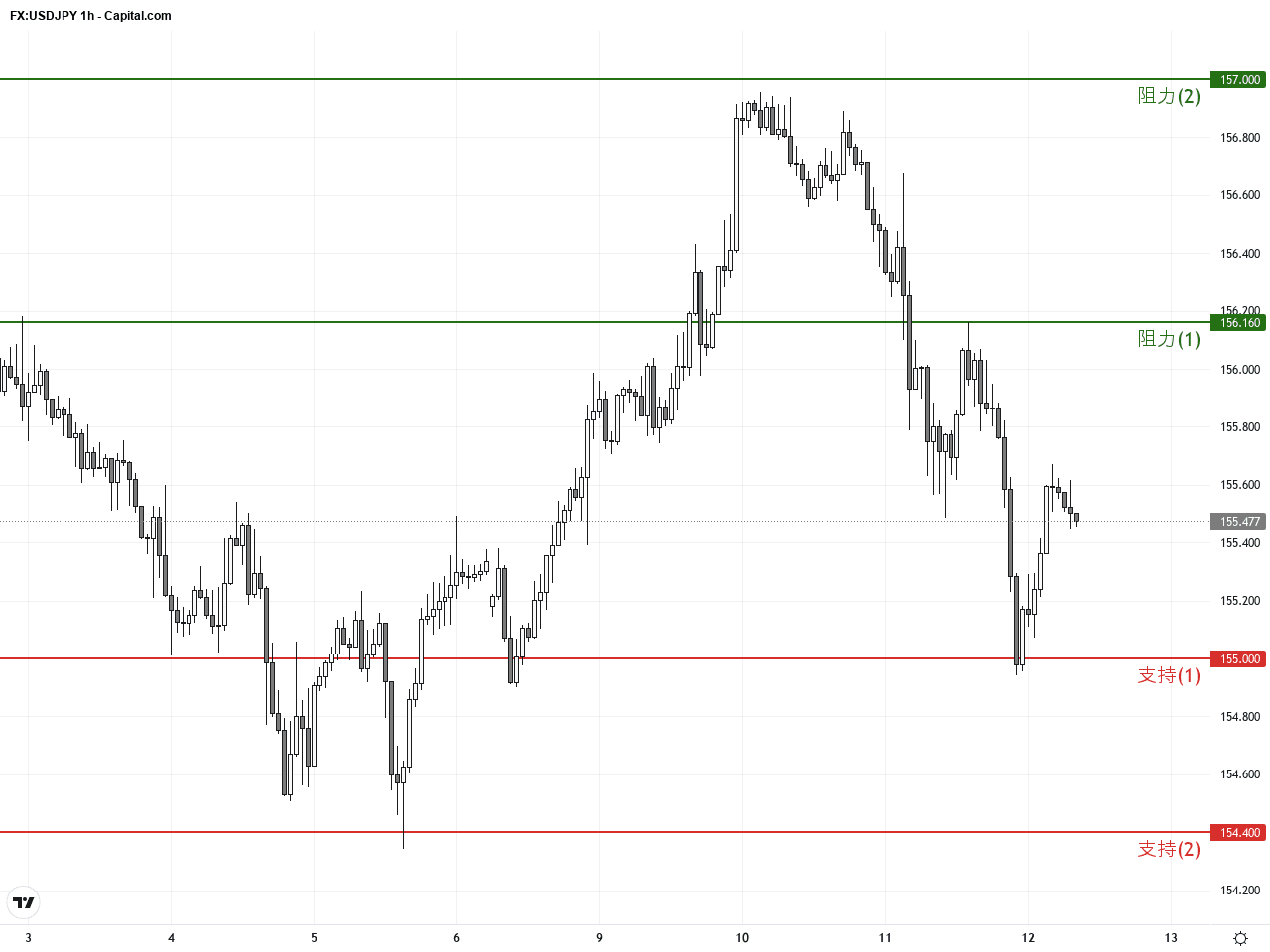 技術面上,USDJPY在日線圖中形成一個漸進下行三角形形態,始於12月初,若價格跌破三角形底部155.0附近,將加速空頭趨勢延伸。此外,1小時圖的MACD死叉和短期均線走弱意味賣壓持續。近期出現的錘子線暗示短期或見短暫反彈,但趨勢轉折仍需更多確鑿信號支撐。綜合來看,觀察155關鍵支撐附近的價格反應至關重要,突破將決定後續動向。