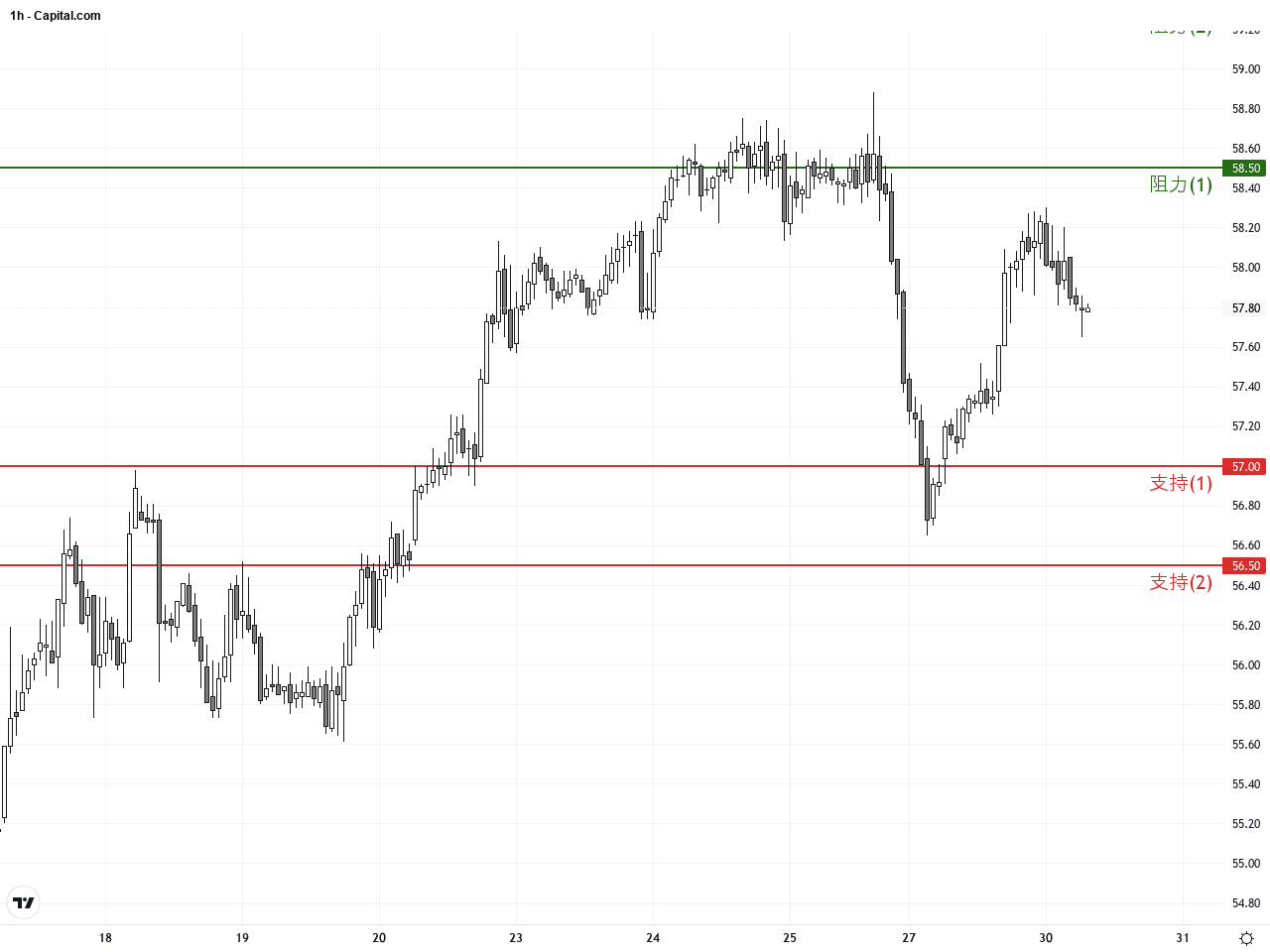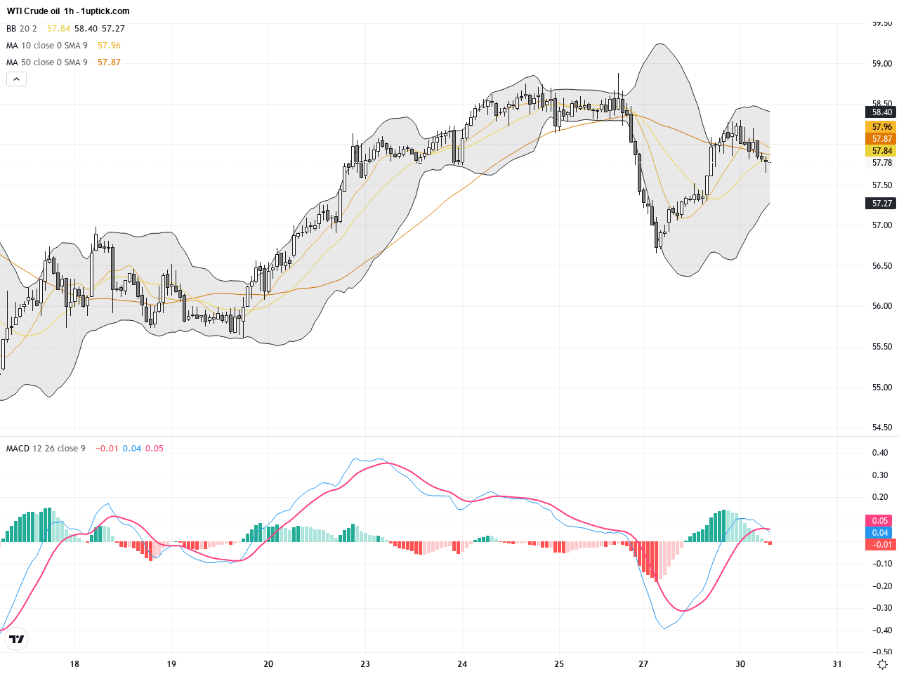 近5日WTI小時圖反映短期價格由56美元底部逐步上行至近期高點58.29美元,呈現一波小型反彈行情。50小時均線支持明顯,價格企穩於布林帶中軸上方,短期動能指標如MACD已形成黃金交叉,RSI處於55附近,顯示動能溫和。近期最顯著的蠟燭組合為12月29日形成的看漲吞沒形態,預示後市24小時可能維持溫和上攻。