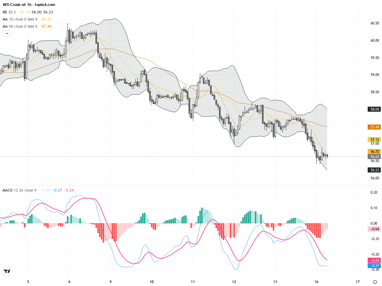 技術面透露出WTI油價正面臨關鍵支撐壓力,MACD死叉和RSI低位顯示下行動能尚存,但日線布林帶下軌與近期形成的錘子線提供潛在反彈機會。若價格能守住56美元整數支撐,短期或有修正反彈,但若失守此關鍵價位,將開啟新一輪深度回調空間。綜合基本面供應過剩與需求疲弱的負面影響,交易者應採取謹慎策略,密切留意價格與成交量變化。今日能源市場無重大經濟數據直接影響WTI價格,投資者需持續關注美國原油庫存報告及全球主要經濟體能源需求指標發布時間,因該類數據將在未來交易日加重市場波動。香港時間(HKT)下晚間將同步美國時間釋出庫存動態,屆時可能觸發WTI價格短線波動。