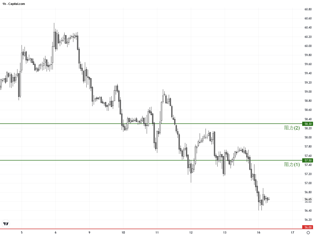 從日線圖觀察,WTI原油自11月中旬以來一路下滑,形成較為明顯的下跌趨勢。近期價格於57美元附近多次嘗試反彈未果,且出現連續的陰線吞沒形態,顯示賣壓強烈。技術指標方面,短期均線(如10日與20日均線)均呈現下行趨勢,MACD負值區間且紅柱減弱,暗示動能偏空。布林帶則顯示價格接近下軌,市場波動加大,存在超賣風險,需密切關注是否出現反轉訊號。