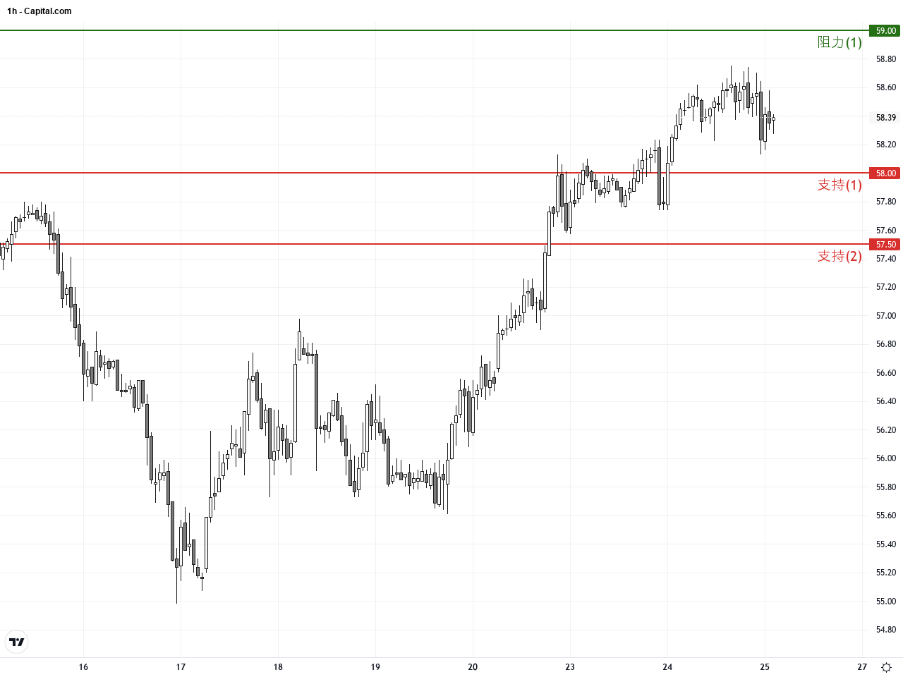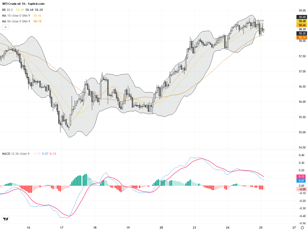 小時圖上,過去三天WTI呈橫盤震蕩格局,價格多次在58.10至58.80美元區間反覆震盪。短期均線(如5期和15期MA)交替突破,顯示市場方向尚未明確。布林帶呈收縮狀態,暗示短線可能迎來波動。MACD指標呈現頂部分歧迹象,暗示可能出現短期回調。近期蠟燭圖中出現看漲吞沒形態,指出未來24小時內或有反彈動力。
