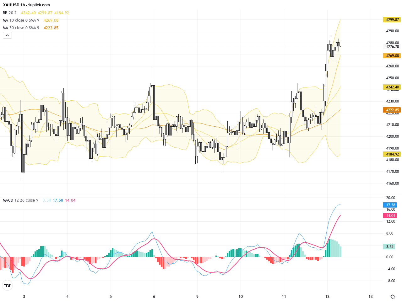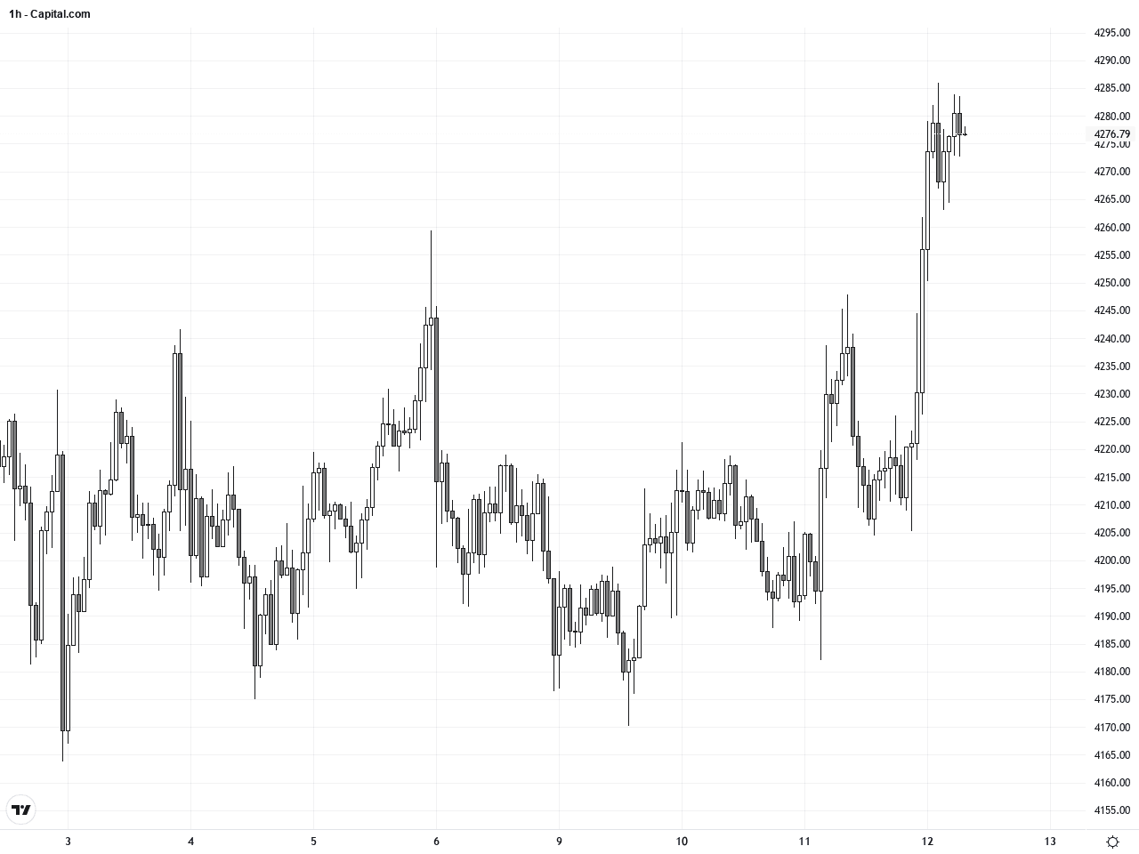 在過去24至48小時內,黃金(XAUUSD)在美聯儲宣布利率下調後,迎來一波強勁反彈,最高價回升至逾一個月高位,昨日收盤價為4,282.39美元。此次利率決議刺激黃金價格顯著上升,投資者紛紛湧入避險資產,推動金價突破4,300美元關口。