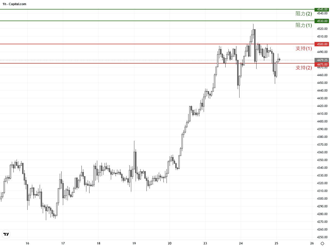 小時圖回顧過去3至5個交易日,黃金價格展現短線震盪式上行。價格在突破短期阻力4530美元後短暫回調,隨後在支撐4500美元附近獲買盤支撐。短期移動平均線(如20小時均線)貼合價格,且MACD指標在零軸上方交叉,反映動能維持穩健。布林帶目前略收窄,短期或存在整固需求,後市如能維持在關鍵均線及支撐上方,續漲機率較高。