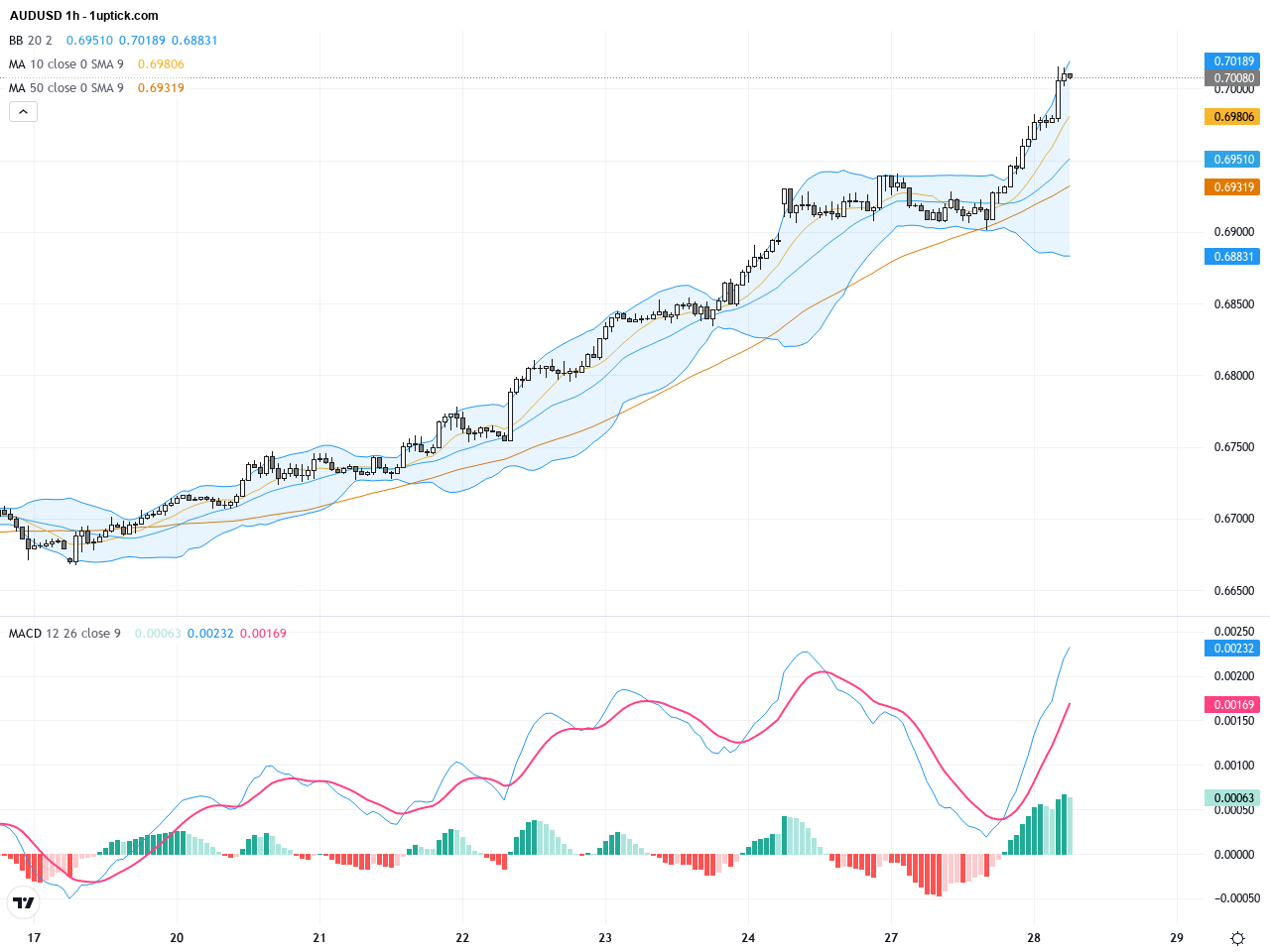 在過去3-5天的時線圖上,AUDUSD經歷了多次短暫回調,但支撐力度良好,價格穩定在0.6900至0.7010區間內波動。短期看,移動平均線持續上扬,布林帶中軸支撐穩固,MACD形成金叉,暗示短期內動能增強。最新出現的蠟燭圖形態為看漲吞沒,顯示接下來24小時內買方力量可能會進一步發力,技術交易者可留意短線入場時機。