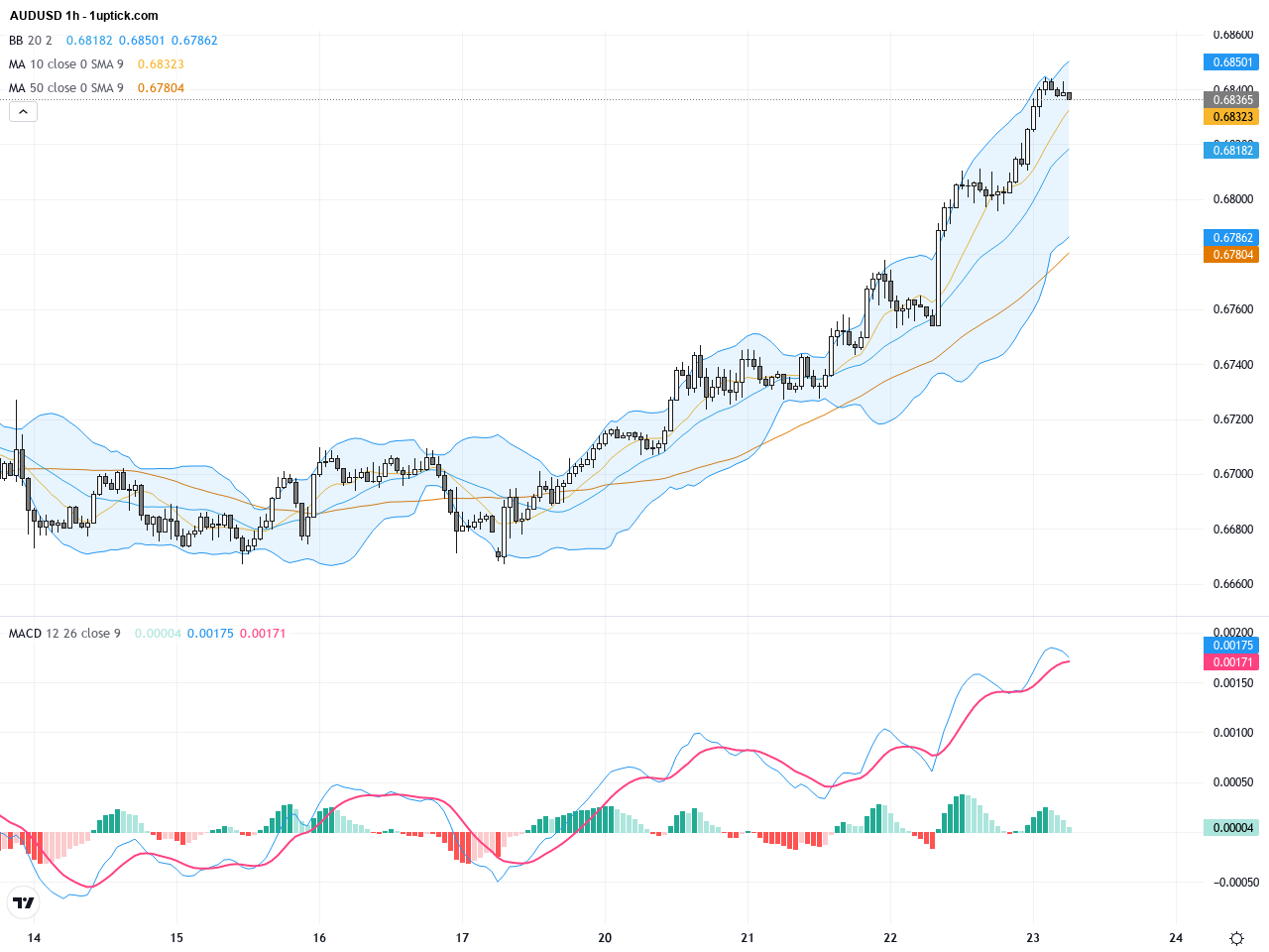 小時圖觀察近期3-5日走勢,AUDUSD呈現階梯式上升,突破多重阻力後短暫整理。20期MA與50期MA形成黃金交叉,利多短線多頭。布林帶中軌被支撐,價格穩定在其上方運行,顯示短線趨勢仍向上。MACD快線在慢線上方且持續升高,伴隨成交量增加,暗示下個交易日延續漲勢的概率較大。近期K線出現了強勢吞沒形態,短期內行情有望續攻。