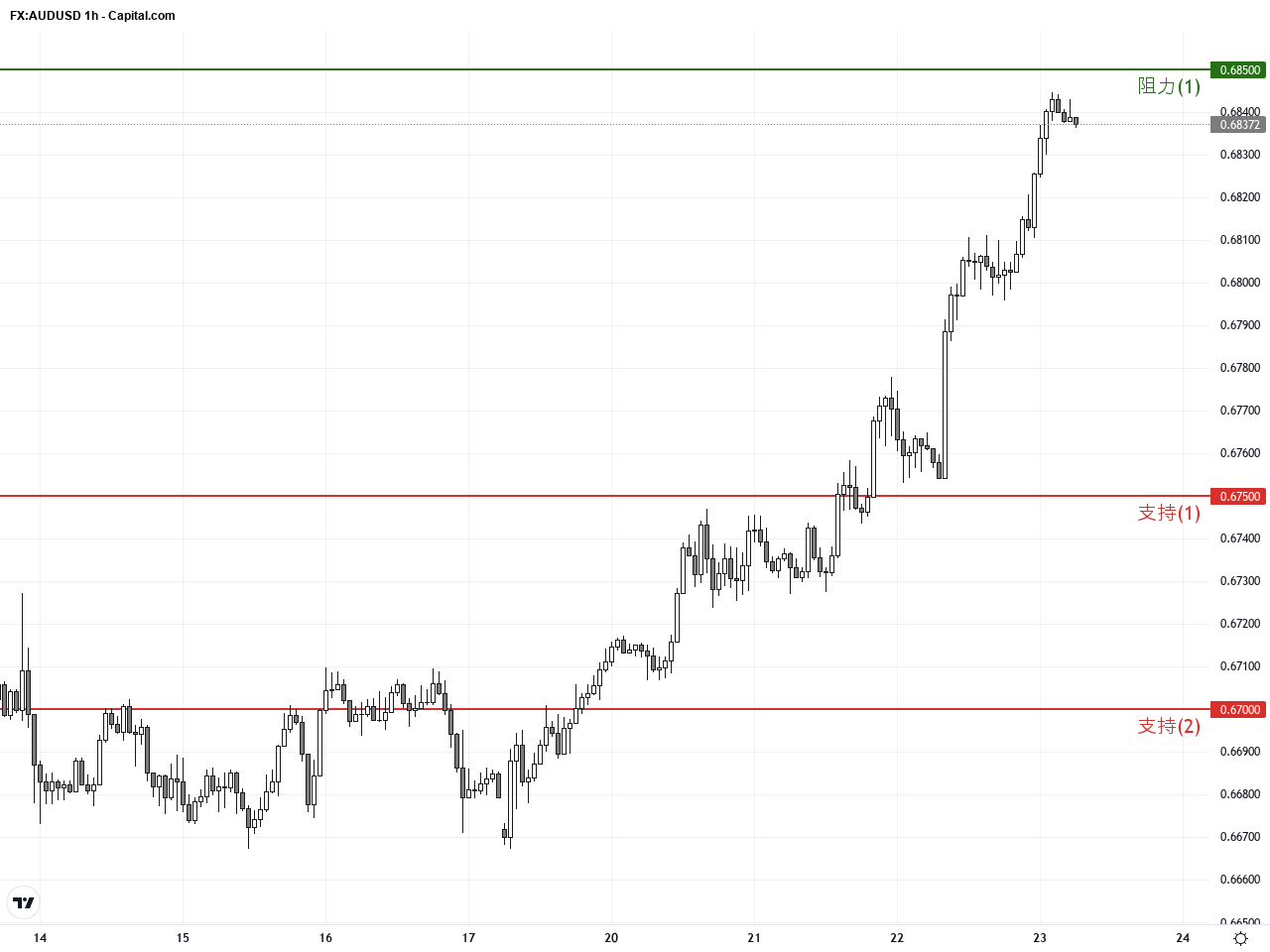 過去24至48小時內,澳元兌美元(AUD/USD)展現出顯著的漲勢,最新收盤價約在0.6839左右,較前一個交易日的0.6761有明顯提升。這波走強主要受到了澳洲強勁就業數據的推動,該數據讓市場對澳洲央行(RBA)加息的預期大幅提升,進而提升了澳元的吸引力。