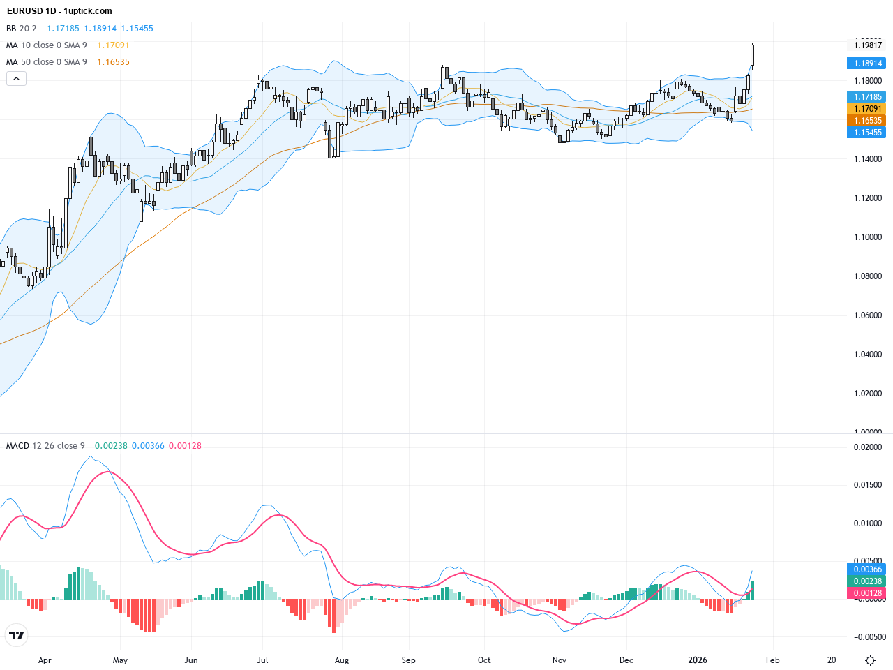 過去24至48小時內,EUR/USD持續展現堅挺走勢,並穩守在近期多月高點1.1907附近,昨日收盤價報1.19817,顯示歐元兌美元正在逼近1.20關鍵阻力位。市場情緒受到多項因素影響,其中美國明尼阿波利斯的動盪事件加劇預算僵局風險,提升聯邦政府關門的擔憂,間接壓制美元表現。