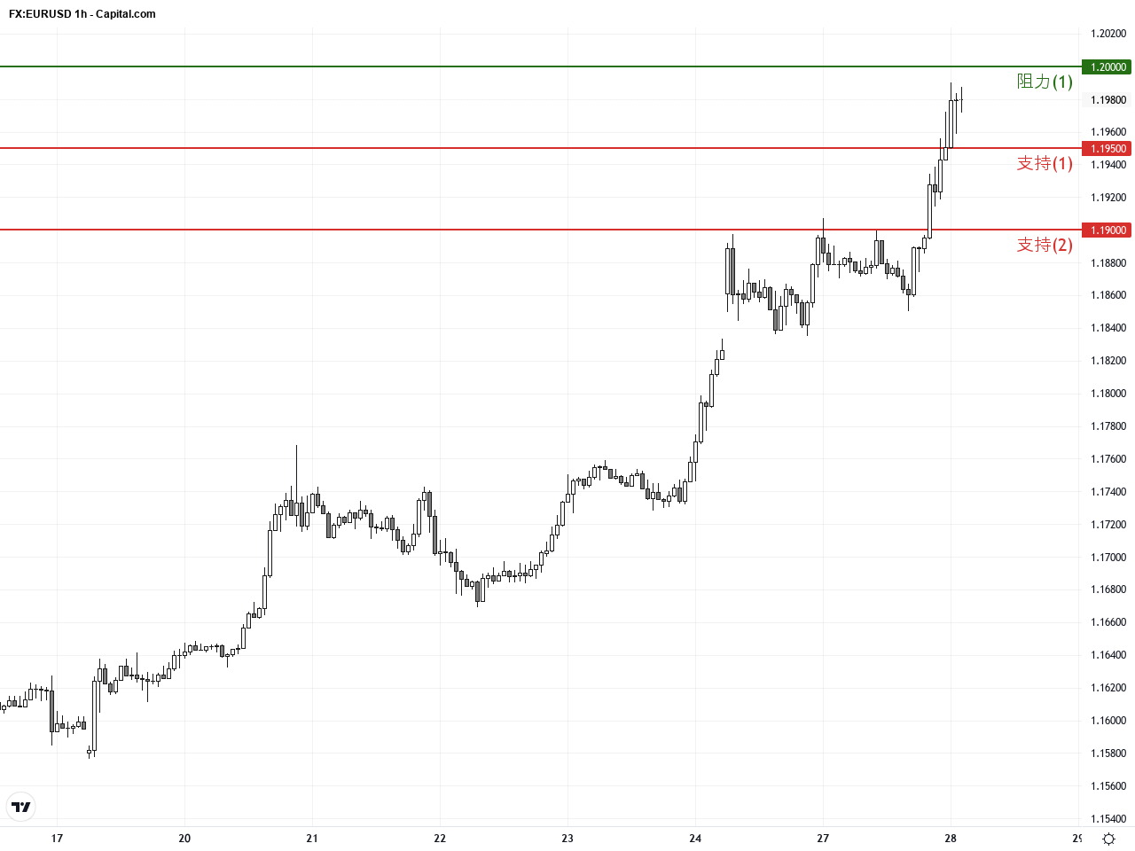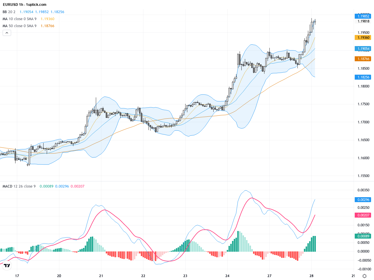在過去3至5天的時間框架中,EURUSD小時圖同樣顯示強勢上升趨勢。價格短期內多次測試1.198至1.20阻力區,短均線(如20小時均線)持續支撐價格。布林帶略偏向擴張且MACD剛剛出現黃金交叉,預示短線動能加強。近期出現一根看漲吞沒K線,暗示未來24小時內多頭有進一步發力的可能。短線市場情緒偏多,支持上攻1.20關口的企圖。