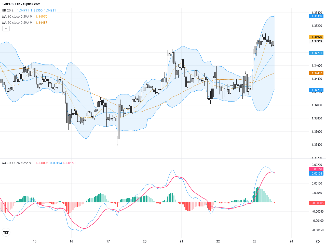 在過去3至5天的時段線圖中,GBPUSD呈現震盪上升走勢,短期內突破1.3500整數關口。移動平均線排列為短期均線上穿長期均線,產生買入信號。Bollinger Bands顯示價格在上軌附近活動,暗示短線可能有短暫回撤風險。MACD於零軸附近形成黃金交叉,進一步確認多頭動能。顯著的近期K線呈現看漲吞沒形態,表明未來24小時內多頭趨勢占優。