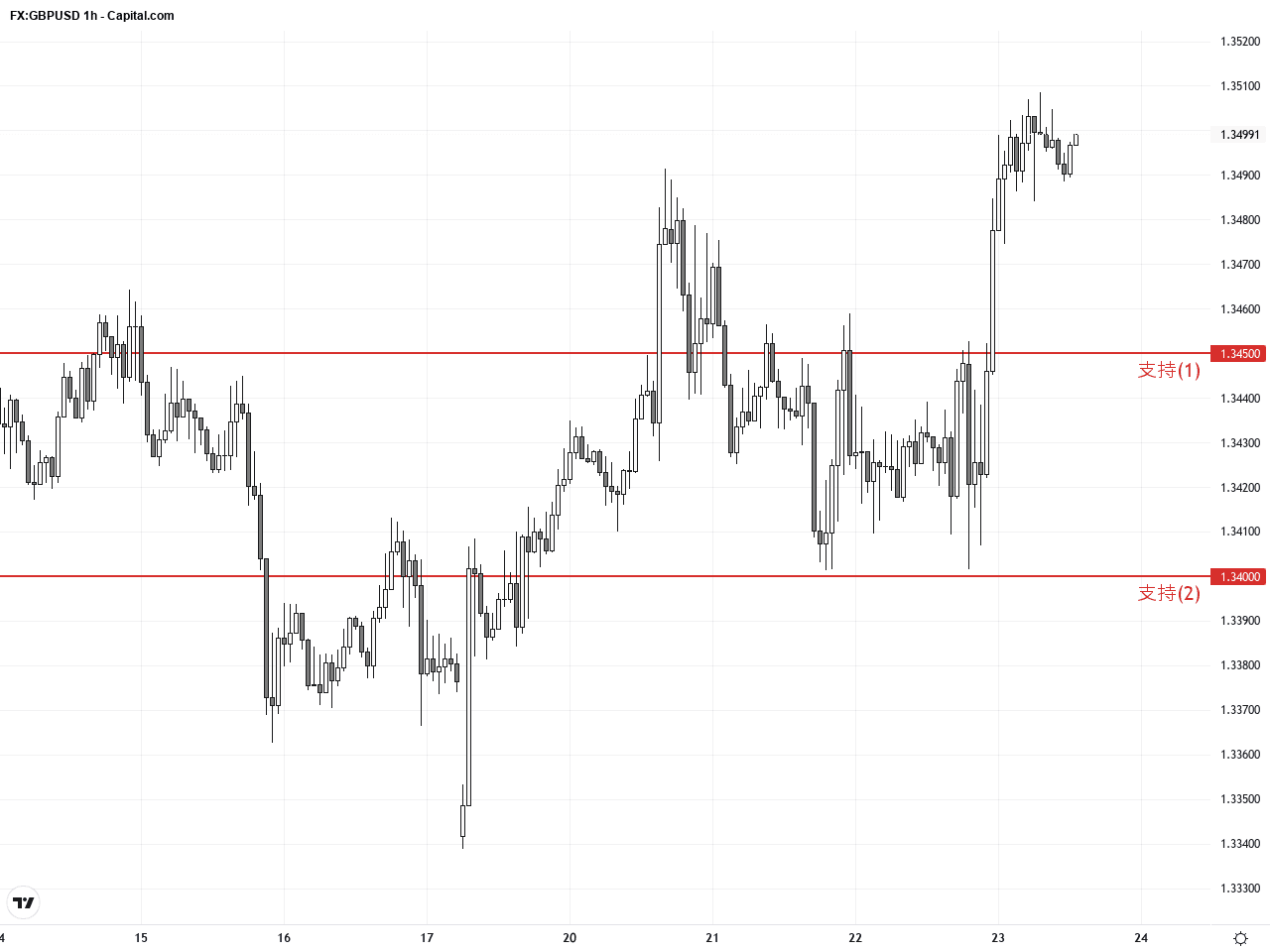 在過去24至48小時內,GBP/USD走勢表現出顯著波動,但整體仍維持在接近昨日收盤價1.34971的水平附近。英鎊兌美元在消息面推動下於1.3484至1.35085區間震盪,顯示市場對於近期政治和經濟動態的消化尚未完結。