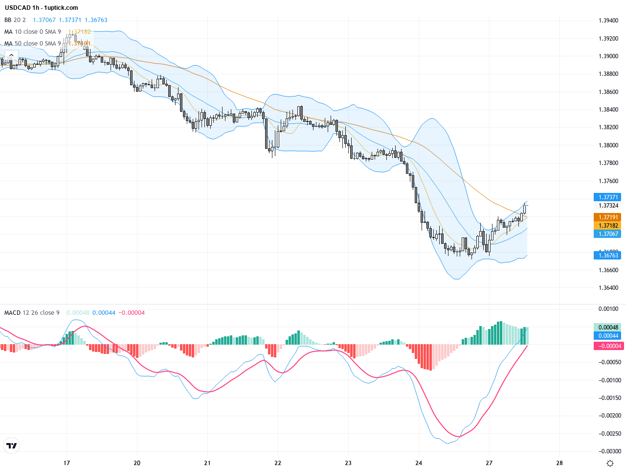 小時線圖顯示,過去3-5日USDCAD經歷多次試探支撐,匯價短線內多次在1.3680至1.3720間反復震盪。短期均線與中期均線交織,MACD進入黃金交叉的早期形態,暗示短線可能出現反彈動能。布林帶近期顯示較低波動區域,暗示市場正等待突破訊號。近期形成的看跌旗型結構若有效突破向下,將可能引發下一輪下跌。