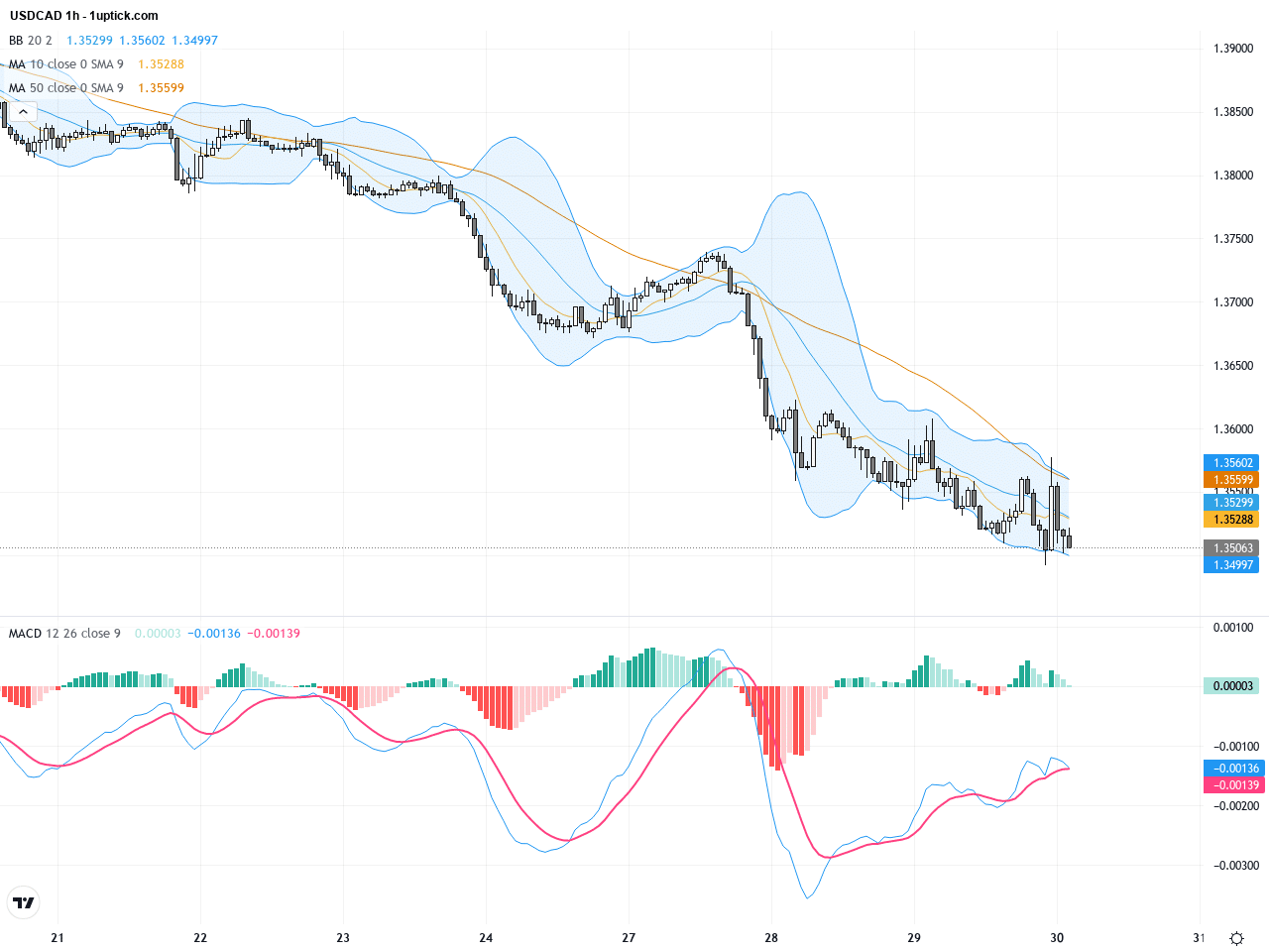 小時線圖中,USDCAD最近3-5日內呈現連續跌勢後出現反彈,價格在1.3500支撐區反覆測試。均線系統保持空頭排列,但短線移動平均線開始出現黃金交叉,預示短期動能回升。MACD柱狀圖縮小及正負線靠攏,暗示價格可能進入震盪整理階段,短線有望在支撐與阻力位間波動。