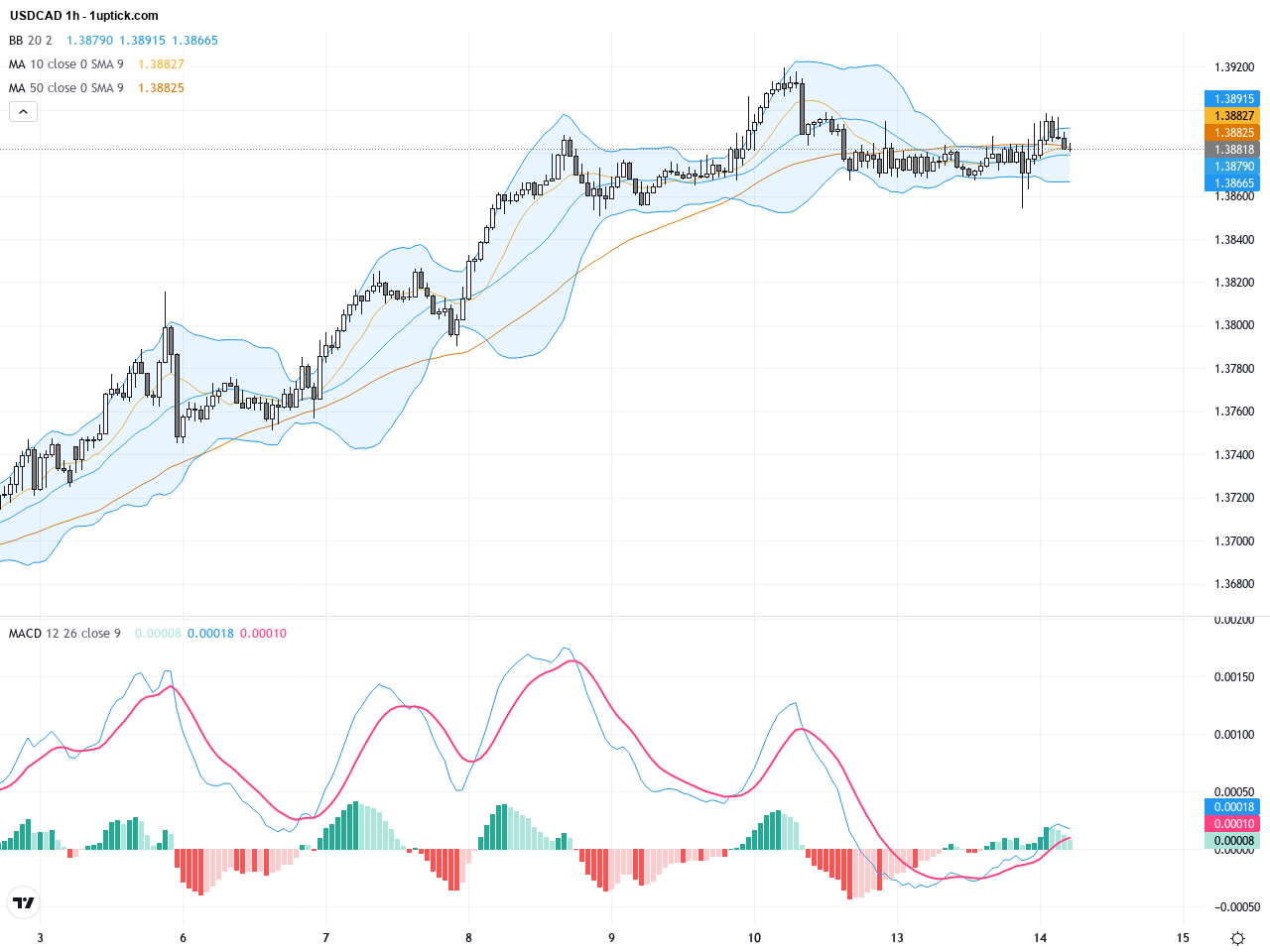 小時線圖顯示過去3-5日,USDCAD在1.385至1.389區間內波動,短均(如9和21 EMA)交錯頻繁,顯示短線動能不穩。布林帶持續收窄,預示可能有突破行情將臨。最值得注意的是近期出現一個晨星形態,暗示短期內價格可能短暫反彈,搭配MACD柱狀圖開始增長,短線多頭力量有望增強,關注價格是否成功守住1.385支撐。