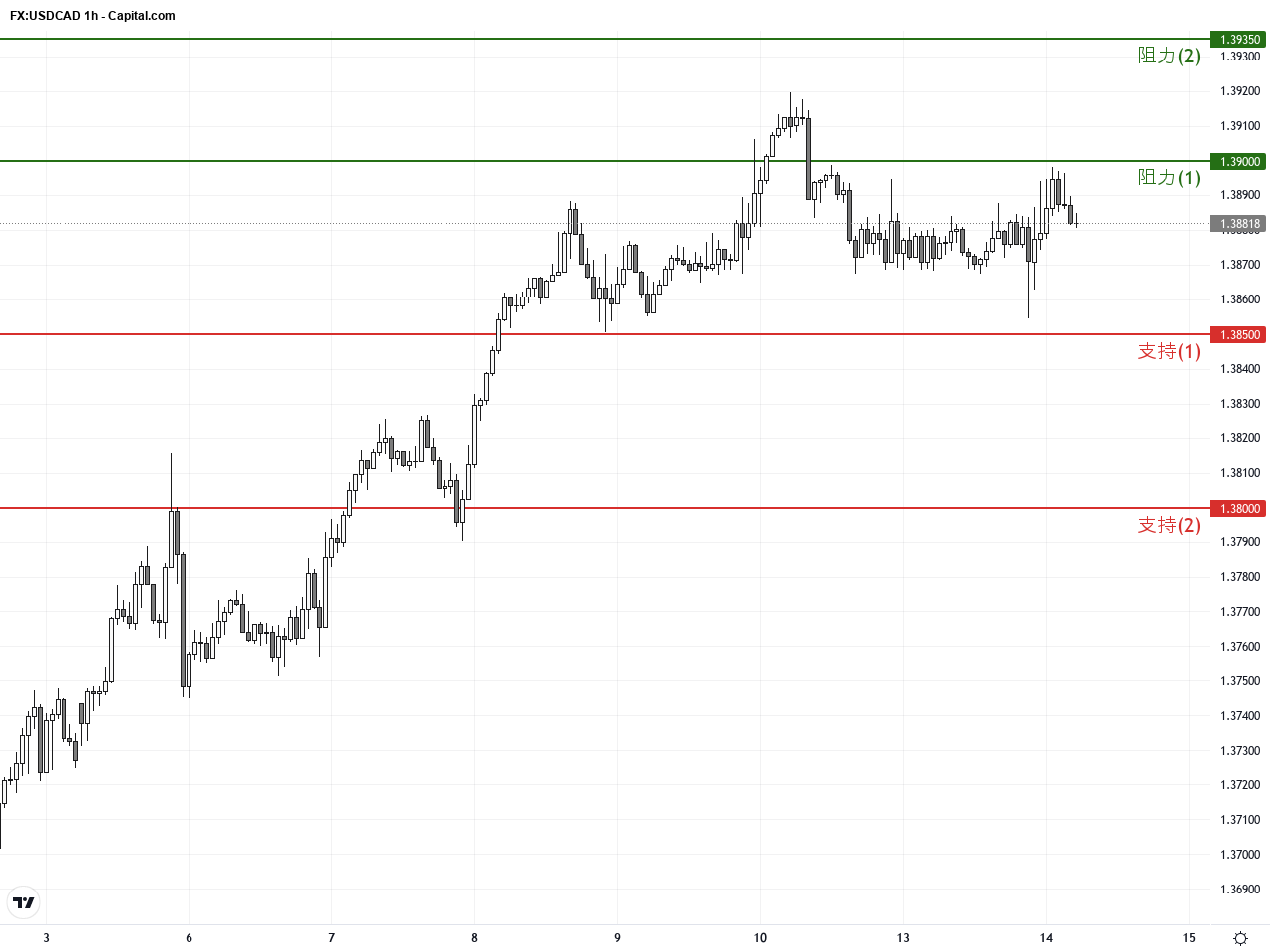 過去24至48小時內,USD/CAD匯率維持在1.385至1.390之間徘徊,市場波動性偏低,但反映出投資者正高度關注即將公布的美國消費者物價指數(CPI)數據。昨日收盤價為1.38816,匯價整體呈現輕微上升態勢,受美國通脹數據預期帶動美元有所支撐。