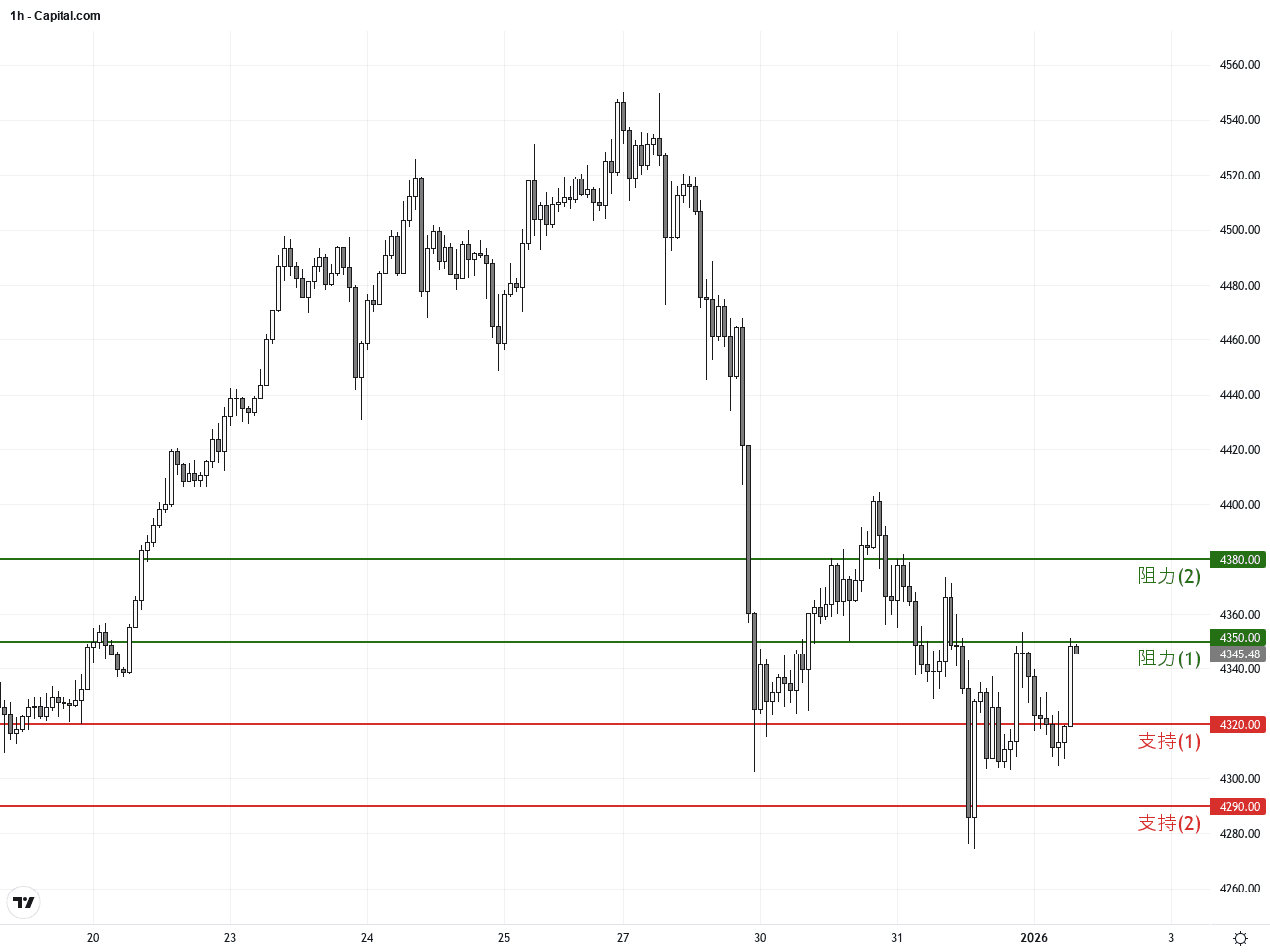 技術面上,XAUUSD在日線圖中出現了潛在的三角形整理形態,該形態始於2025年12月底,若價格突破上沿,短線可能迎來加速上行。近期最顯著的K線形態為1月1日的看跌吞沒形態,暗示短期可能見到技術性回調。投資者應密切關注關鍵支撐4320美元附近的反應,以判斷回調深淺與後市走勢。今日(1月2日)全球經濟日曆中,未見直接影響XAUUSD的重大經濟事件。投資者需留意後續市場消息變化,特別是美元走勢及避險情緒變化,將對XAUUSD價格帶來波動。