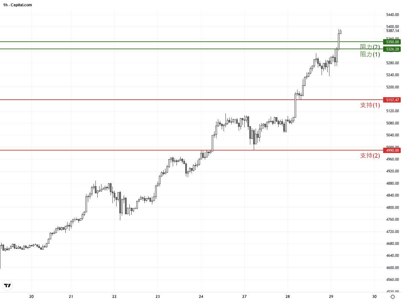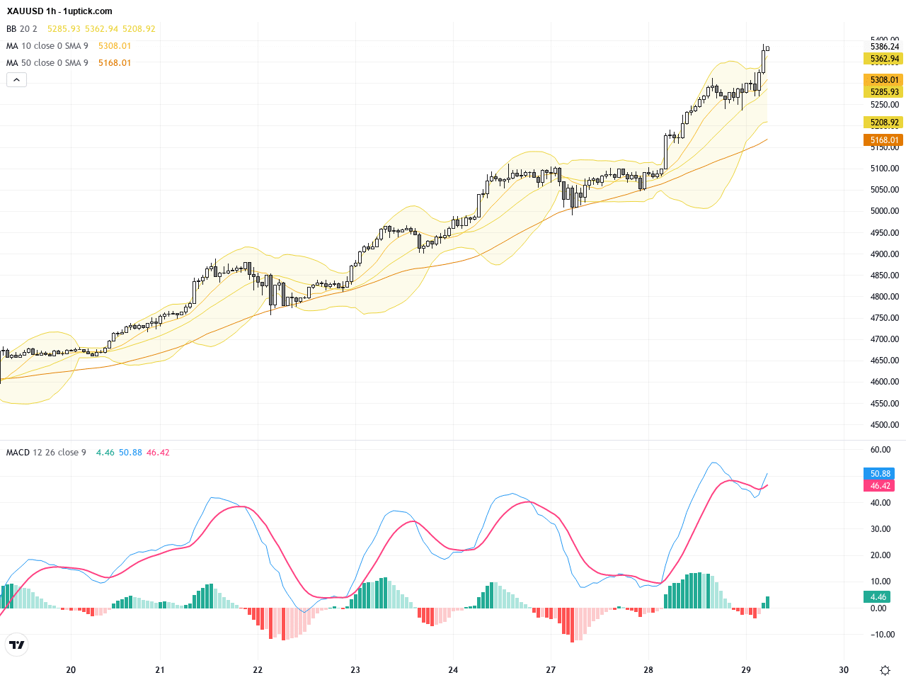 從日線圖來看,XAUUSD 自年初以來呈現明顯上升趨勢,近期突破了前期多次測試的阻力位並創下歷史新高(超過5300美元)。布林帶呈現擴散,表明波動性擴大,價格在布林帶上軌附近運行,趨勢強勁。MACD指標雖然仍處於高位,但開始顯示動能減緩的跡象,提示短期或出現調整。整體趨勢欲往更高點發展,但需留意動能背離風險。