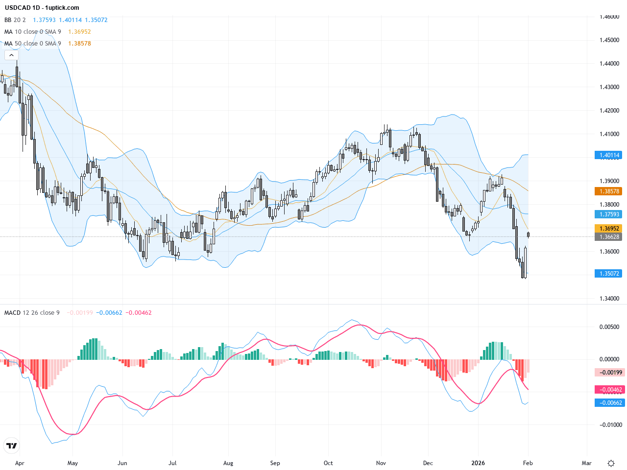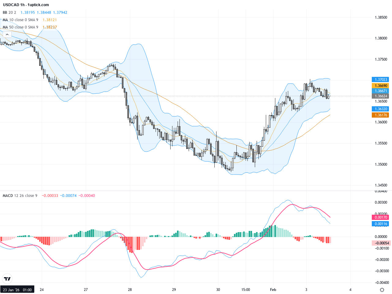 技術面關鍵信號為日線圖1.3650支撐的重要性,若失守則有望下探1.3500附近。此外,小時線MACD可能出現黃金交叉,暗示短線反彈機會存在。近期油價持續疲軟壓制加幣,美元動能因美國宏觀經濟指標強勁而加固。交易者應注意價格接近布林帶下軌時的反彈和破位形態,及時調整止損策略。
