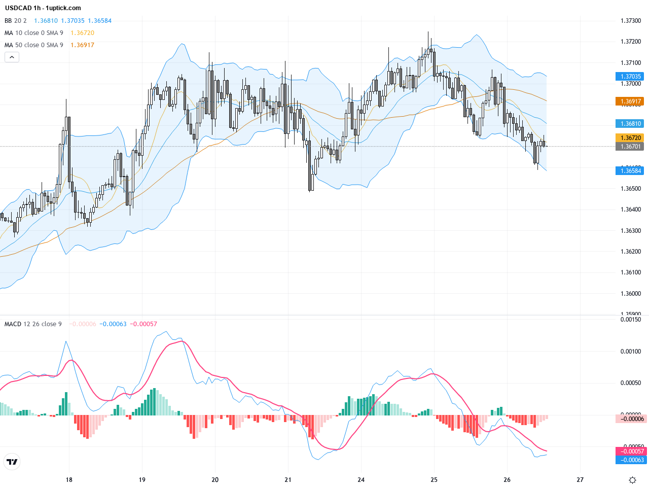 近5個交易日的1小時圖中,USDCAD波動加劇,顯示成交量在關鍵水平1.3700-1.3728之間加大。短期均線呈多頭排列,尤其是20 EMA作為動態支撐。MACD近期出現正向動能交叉,表明短線上漲動力增強。然而,價格臨近布林帶上軌,短期或有回調需求。最近的空頭吞沒K線提示日內可能出現震盪調整,需關注能否守住1.3670支撐。