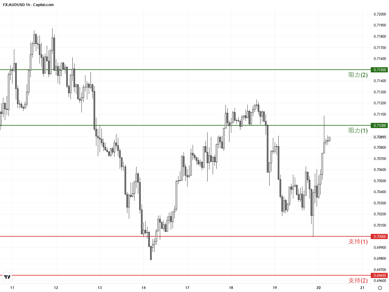 過去24至48小時,AUD/USD呈現明顯上揚,匯價由前日收盤的0.70347美元漲至0.70868美元,約上升0.74%。這波上升主要受到美元走弱及商品價格波動的雙重影響。儘管市場對美聯儲延後加息的預期有所遲疑,美元整體表現軟弱,給澳元兌美元帶來了利好。美國原油價格的約4.21%下滑,也進一步壓制了美元兌其他貨幣的表現,間接助推AUD/USD上漲。
