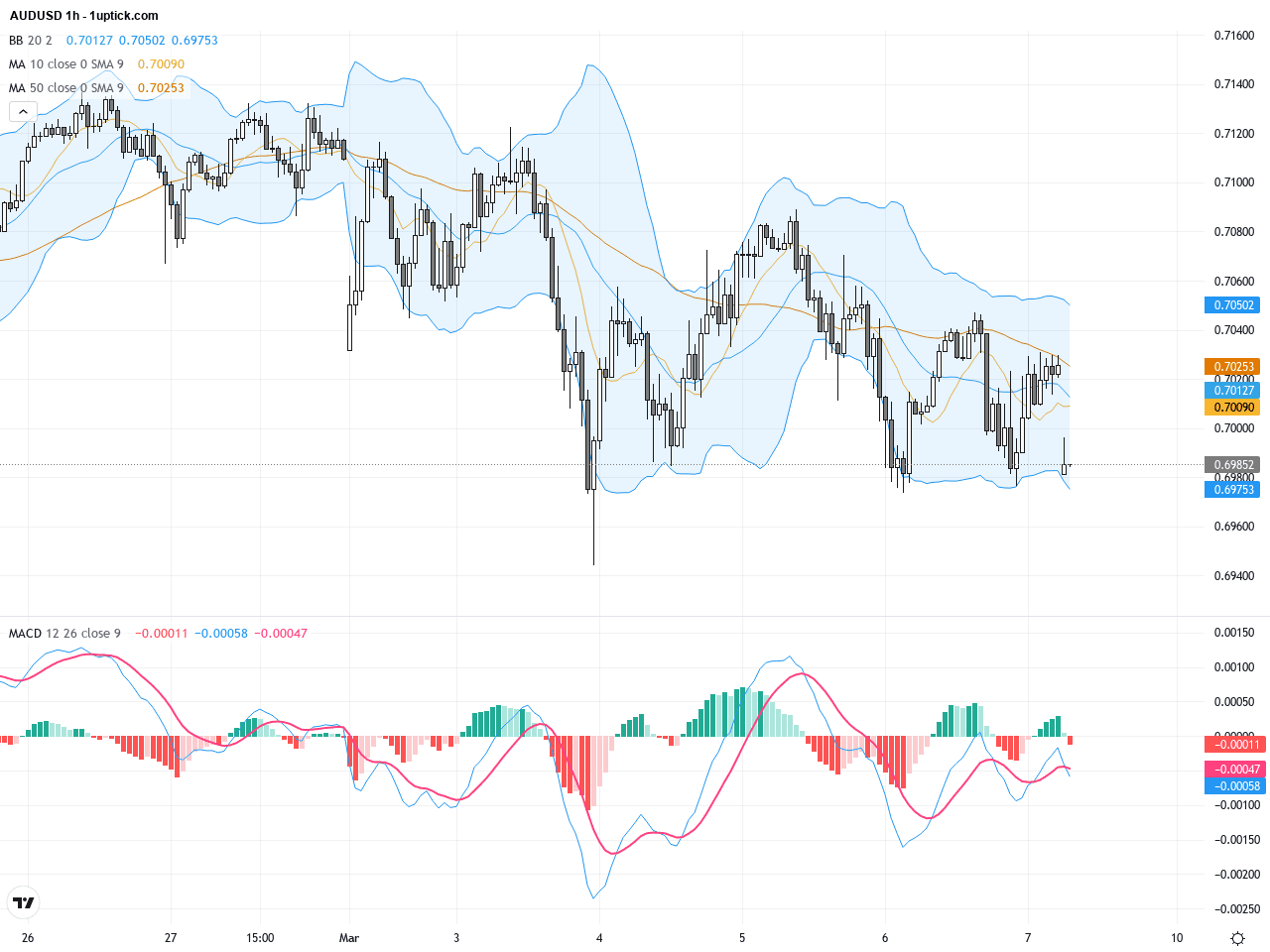 從過去三至五日的整體走勢來看,AUDUSD在0.6980至0.7040間反覆震盪,短線呈現明顯的整固結構。價格多次觸及上方0.7047阻力未能突破,形成短期橫盤格局。20期EMA作為動態支撐,短線保持上揚態勢,暗示短期內買方力量相對強勢。Bollinger Bands收緊反映盤整格局,而MACD在零軸附近交叉,RSI指標維持中性區,顯示短期可能進一步試探重要價位。